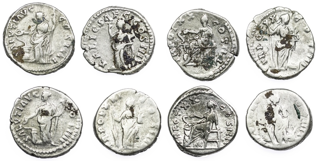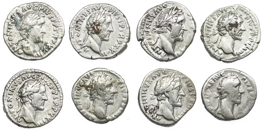 Roman Empire, Antoninus Pius (AD 138-161), AR Denarii (8): i) Rome, ANTONINVS AVG PIVS P P IMP II, laureate head right, rev. TR POT XX COS IIII, Salus seated left, feeding snake around altar with patera, 3.08g possible plate copy (RIC 264; BMC 882 [Spink XRF: Obverse: 90.71% Au; 8.36% Cu; 0.926% Pb; Reverse: 73.78% Ag; 25.30% cu; 0.771 % Pb; 0.16% Ga]), verdigris to reverse, about fine; ii) another, as before, 3.52g, fine to good fine; iii) another, as before, rev. TR POT XX COS IIII, Annona standing right with rudder and modius, foot on prow, 2.68g (RIC 260; BMC 883), good to fine; iv) another, as before, ANTONINVS AVG PIVS [...], rev. TR P[OT ...] COS IIII, Annona standing right with rudder and modius, foot on prow, 3.18g (RIC 260ff; BMC 883ff), fair to good; v) another, as before, ANTONINVS AVG PIVS P P IMP II, rev. TR POT XXI COS IIII, Annona standing right, holding rudder and modius, foot on prow, 3.12g (RIC 275; BMC 908), softly-struck, good to fine; vi) another, as before, ANTONINVS AVG PIVS P P TR P XXII, rev. FELIC SAEC COS IIII, Felicitas standing right, holding caduceus, 3.10g (RIC 298; BMC 970), about fine; vii) ANTONINVS AVG PIVS P P TR P XXIII, rev. SALVTI AVG COS IIII, Salus standing left, feeding snake around altar with patera and holding sceptre, 2.74g (RIC 304; BMC 987), near fine; viii) another, as before, 3.37g, verdigris, yet good to fine; (8).