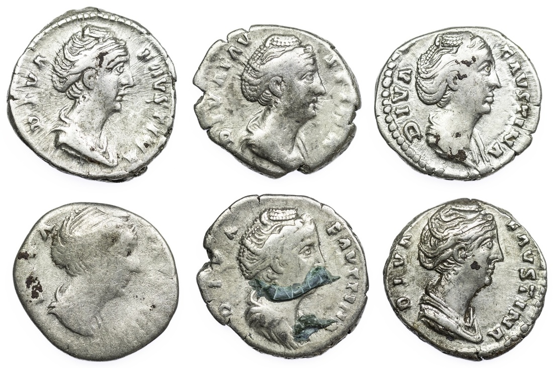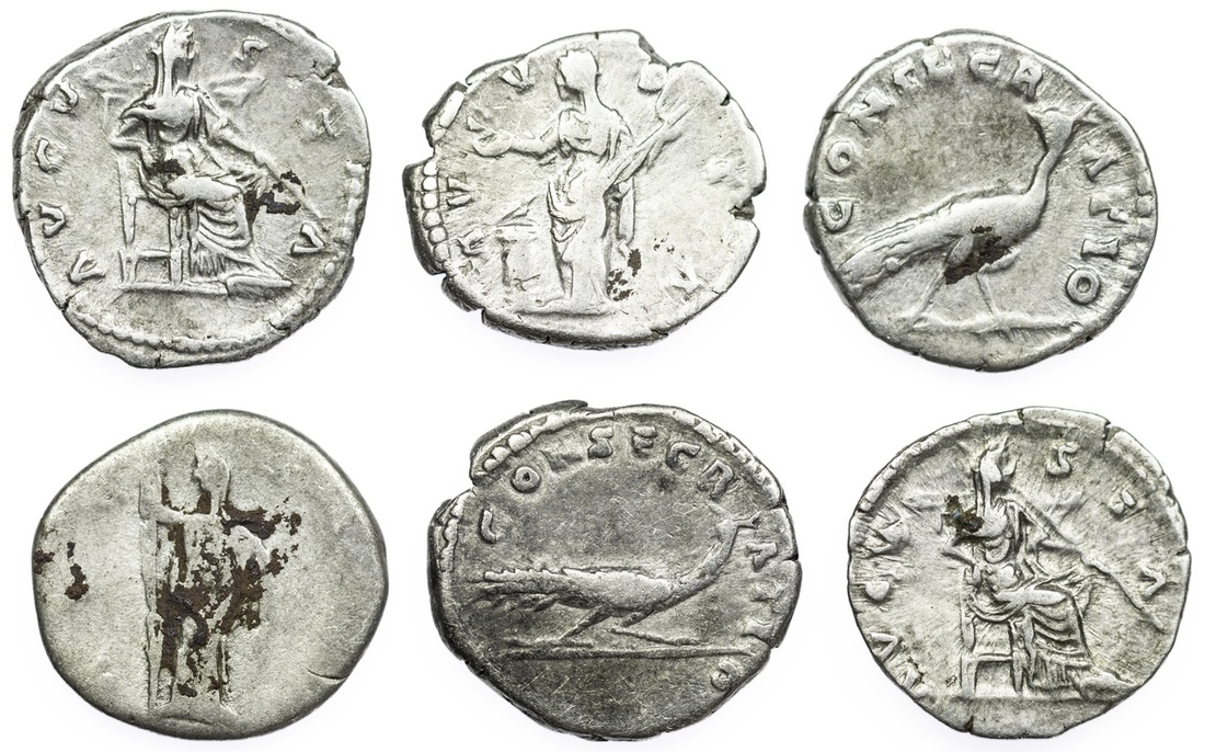 Roman Empire, Faustina the Elder, struck under Antoninus Pius (AD 138-161), AR Denarii (6): i) Rome, DIVA FAVSTINA, draped bust right, rev. AVGVSTA, Ceres standing left, holding torch and fold of skirt, 1.68g (RIC 362; BMC 421), heavily worn, fair; ii) another, as before, AVGVSTA, Juno standing right, 2.61g (RIC 363; BMC 428), good fine or better, toned; iii) another, as before, 3.33g, good fine; iv) another, as before, rev. AVGVSTA, Vesta standing left, sacrificing over altar, 2.78g (RIC 370; BMC 440), good to fine; v) another, as before, rev. CONSECRATIO, peacock advancing right, 2.80g (RIC 384; BMC 473), lamentable verdigris, about good; vi) another, as before, 2.81g, good to fine; (6).