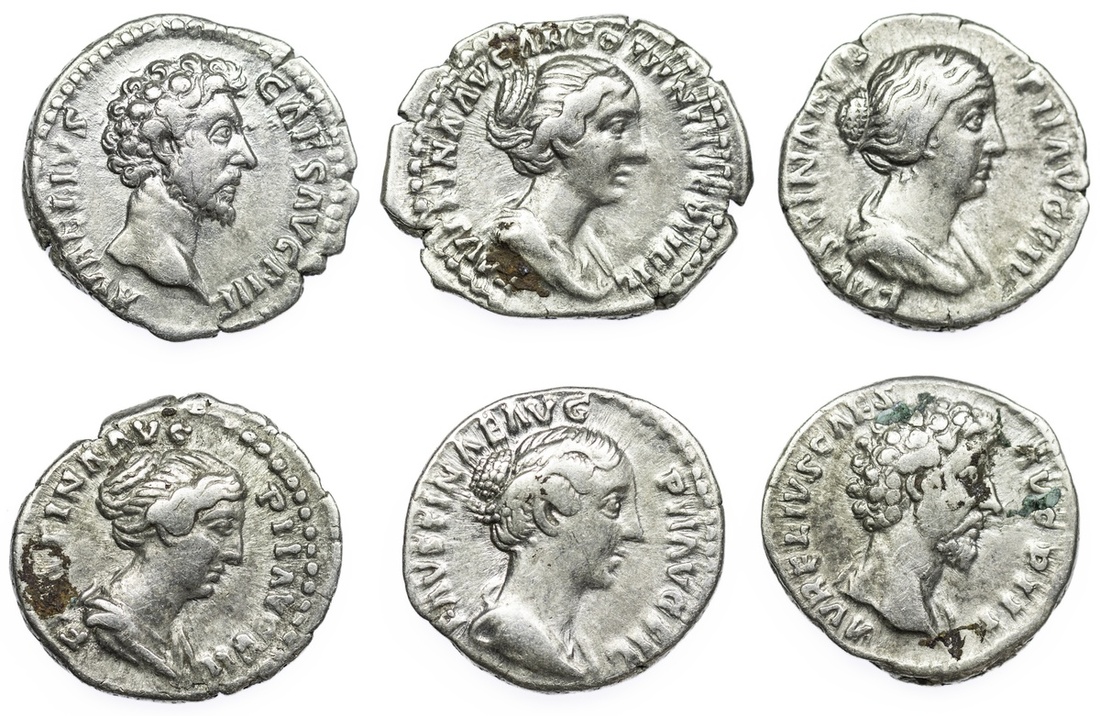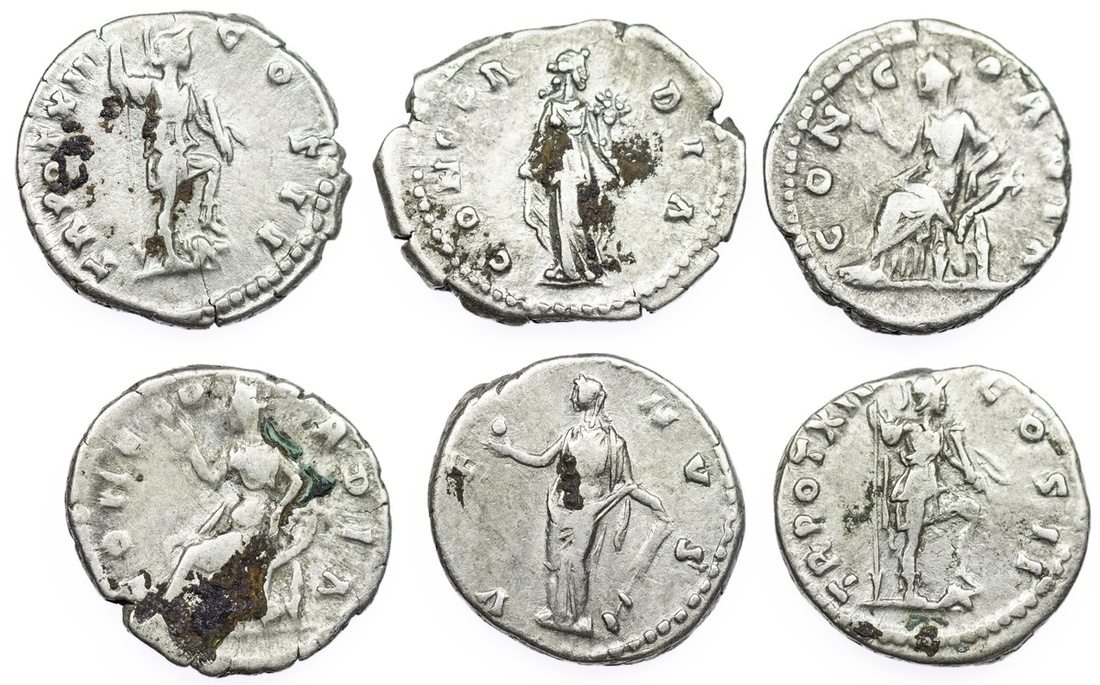 Roman Empire, Marcus Aurelius, as Caesar, (AD 139-161), AR Denarii (6): i) Rome, struck 158-159, AVRELIVS CAESAR AVG PII F COS, bare head right, rev. TR POT XIII COS II, Virtus stepping on helmet right, holding spear and parazonium, 2.86g (RIC 480e; BMC 963 var.), some corrosion to reverse, near very fine; ii) another, as before, with a draped bust, 3.08g, deposits and verdigris, fine; iii) Faustina the Younger, struck under Antoninus Pius (AD 138-161), AR Denarius, Rome, FAVSTINA AVG ANTONINI AVG PII FIL, draped bust right, rev. CONCORDIA, Concordia standing facing, head right, holding cornucopiae and raising skirt, 3.15g (RIC 501; BMC 1078), deposits to surface, otherwise fine to good fine; iv) another, Possible Contemporary Plated Forgery (per BM Report), as before, but with Concordia seated left, holding patera and resting arm on cornucopiae, 2.57g (RIC 502a; BMC 1086), corroded to reverse, otherwise good to fine; v) another, as before, 2.52g, good fine or better; vi) another, as before, rev. VENVS, Venus standing left, 3.51g (RIC 517c; BMC 1091 var. (cf. BM 1946, 1004.149), fine or better; (6).