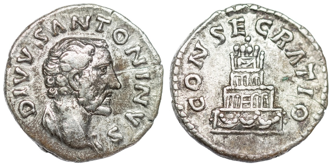 Roman Empire, Divus Antoninus Pius, struck under Marcus Aurelius (AD 161-180), AR Denarius, Rome, DIVVS ANTONINVS, bare head right, with slight drapery, rev. CONSECRATIO, pyre in four tiers, decorated with garlands and statues, door in second tier, facing quadriga on top, 2.62g (RIC 438; BMC 60), darkly toned, good very fine or better