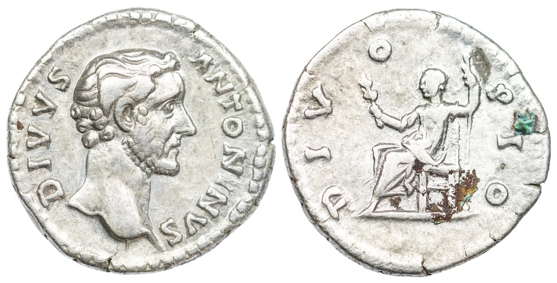 Roman Empire, Divus Antoninus Pius, struck under Marcus Aurelius (AD 161-180), AR Denarius, Rome, DIVVS ANTONINVS, bare head right, rev. DIVO PIO, Antoninus seated left, holding branch and sceptre, 3.28g (RIC 442; BMC 65), good fine to very fine