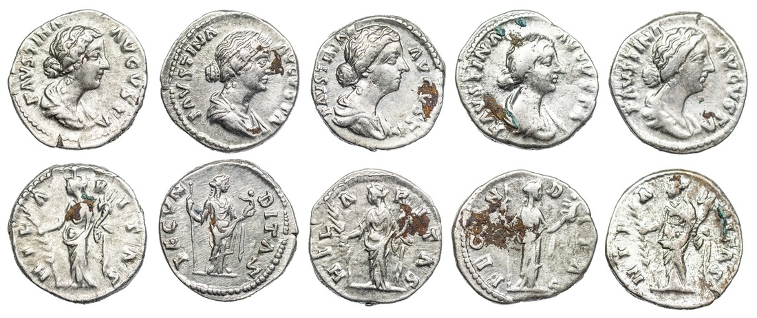 Roman Empire, Faustina the Younger, struck under Marcus Aurelius (AD 161-180), AR Denarii (5): i) Rome, FAVSTINA AVGVSTA, draped bust right, rev. FECVNDITAS, Fecunditas standing right, holding child and sceptre, 3.30g (RIC 677; BMC 92), very fine to good very fine; ii) another, as before, 3.09g, some corrosion, fine; iii) another, as before, rev. HILARITAS, Hilaritas standing left, holding long palm and cornucopiae, 3.04g (RIC 686; BMC 101), good to fine; iv) another, as before, 2.74g, about fine; v) another, as before, 2.92g, good fine to very fine; (5).