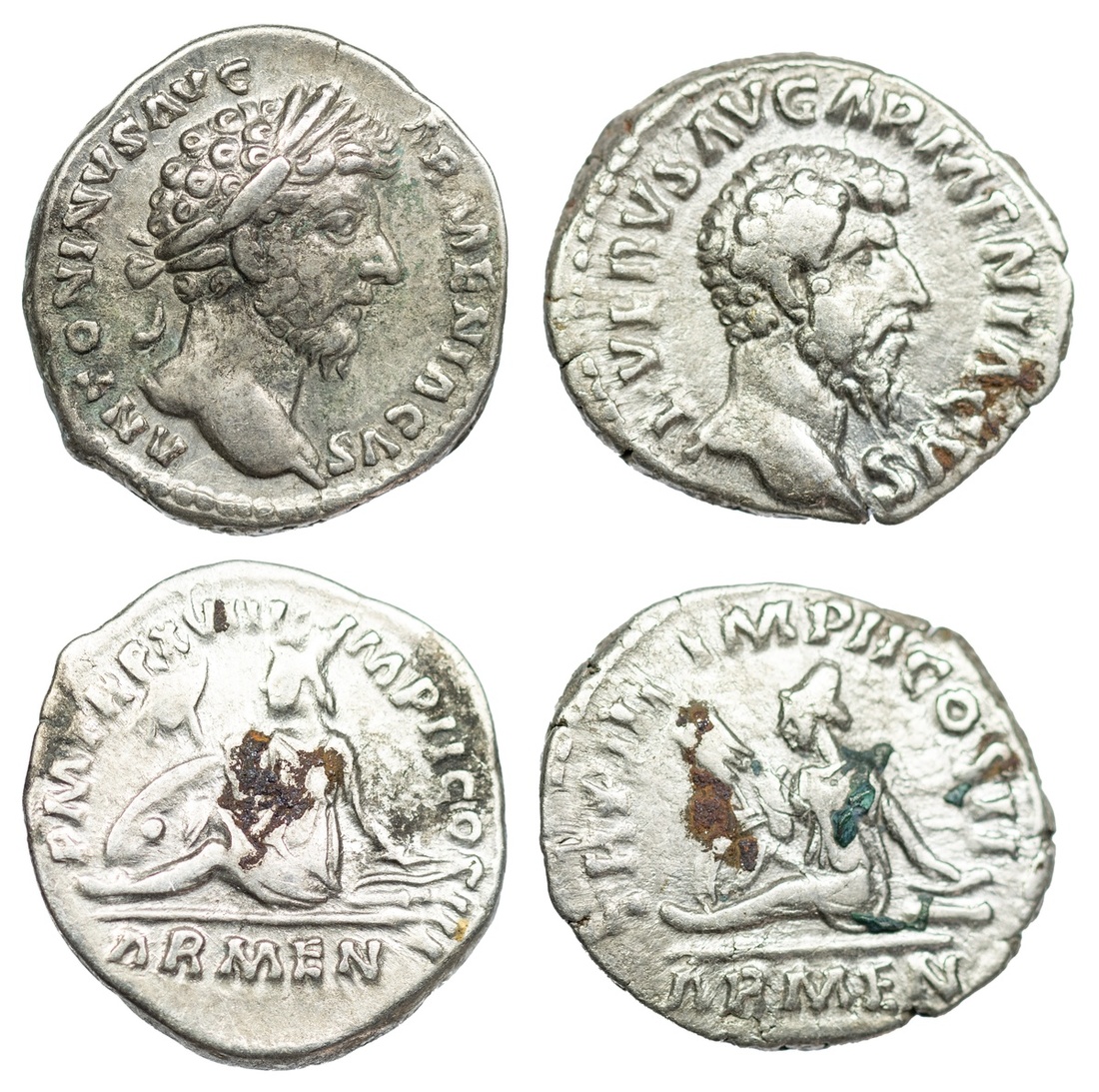 Roman Empire, a Pair of Co-Emperors' Celebratory Issues (2): i) Lucius Verus (AD 161-169), AR Denarius, Rome, struck Autumn-December 163, L VERVS ARMENIACVS, bare head right, rev. TR P III IMP II COS II, Armenia seated left in attitude of mourning, wearing peaked cap, shield and vexillium behind her, her left hand resting on bow, ARMEN in exergue, 2.83g (RIC 501; BMC 239 var.), portrait softened, deposits to reverse, good fine or thereabouts; Marcus Aurelius (AD 161-180), struck 164-165), ANTONINVS AVG ARMENIACVS, laureate head right, rev. P M TR P XVIII IMP II COS III, Armenia seated left, as before, ARMEN in exergue, 2.82g (RIC 81; BMC 274), slightly rough, fine to good fine; (2).