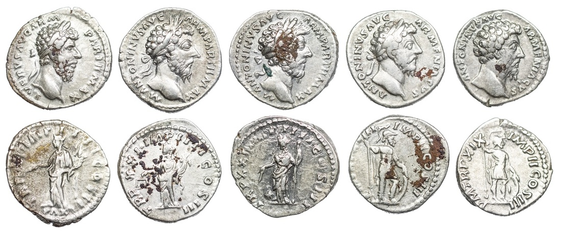 Roman Empire, Marcus Aurelius (AD 161-180), AR Denarii (5): i) Rome, ANTONINVS AVG ARMENIACVS, laureate head right, rev. P M TR P XVIII IMP II COS III, Mars standing right, holding spear and shield, 3.32g (RIC 92; BMC 264), good fine; ii) another, bare head right, rev. P M TR P XIX IMP II COS III, as before, 2.66g (RIC 123; BMC 357), very fine; iii) Lucius Verus (AD 161-169), L VERVS AVG ARM PARTH MAX, laureate head right, rev. P M TR P VI IMP IIII COS III, Pax standing left, holding olive branch and cornucopiae, 2.97g (RIC 561; BMC 426), nice portrait, good fine to very fine; iv) Marcus Aurelius, M ANTONINVS AVG ARM PARTH MAX, laureate head right, rev. TR P XXI IMP IIII COS III, Aequitas standing left, holding scales and cornucopiae, 3.21g (RIC 171; BMC 435), some deposits to reverse, good fine or better; v) another, as before, rev. TR P XXI IMP IIII COS III, Providentia standing left, holding sceptre and wand over globe, 3.32g (RIC 170; BMC 439), good fine, scarce; (5).