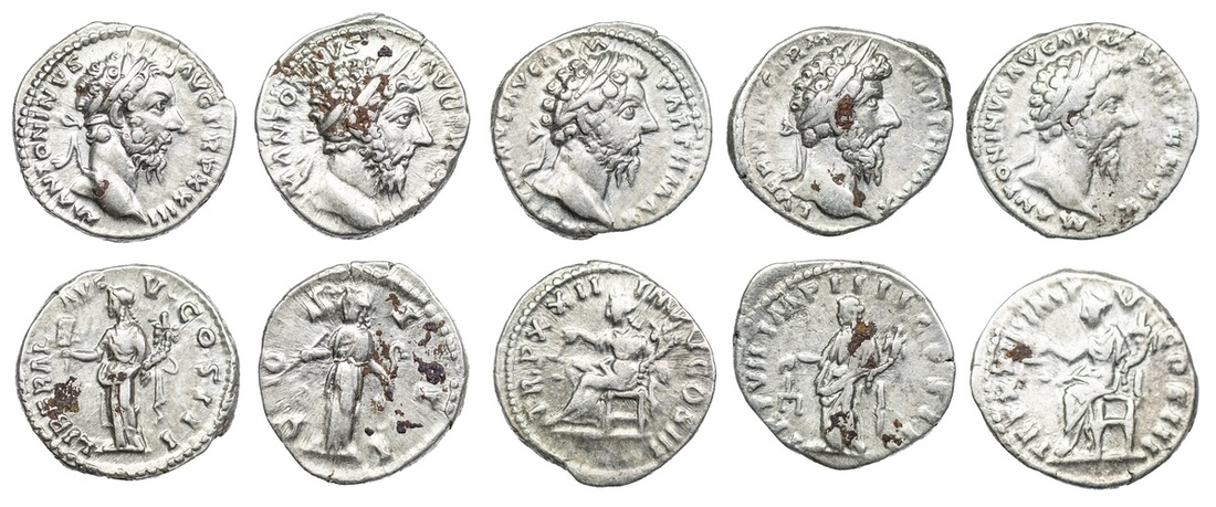 Roman Empire, Lucius Verus (AD 161-169), AR Denarii (5): i) Rome, L VERVS AVG ARM PARTH MAX, laureate head right, rev. TR P VII IMP IIII COS III, Aequitas standing left, holding cornucopiae and scales, 2.84g (RIC 576; BMC 447), good fine; ii) Marcus Aurelius (AD 161-180), AR Denarius, Rome, M ANTONINVS AVG ARM PARTH MAX, laureate head right, rev. TR P XXII IMP V COS III, Aequitas seated left, holding scales and cornucopiae, 2.89g (RIC 191; BMC 462), fine; iii) another, as before, 2.76g, good fine; iv) another, as before, M ANTONINVS AVG TR P XXIII, rev. LIBERAL AVG V COS III, Liberalitas standing left, holding cornucopiae and abacus, 3.72g (RIC 206; BMC 492), great portrait, good very fine; v) another, as before, rev. COS IIII, Diana standing left, holding bow and arrow, 2.75g (RIC 212; BMC 492), good fine; (5).
