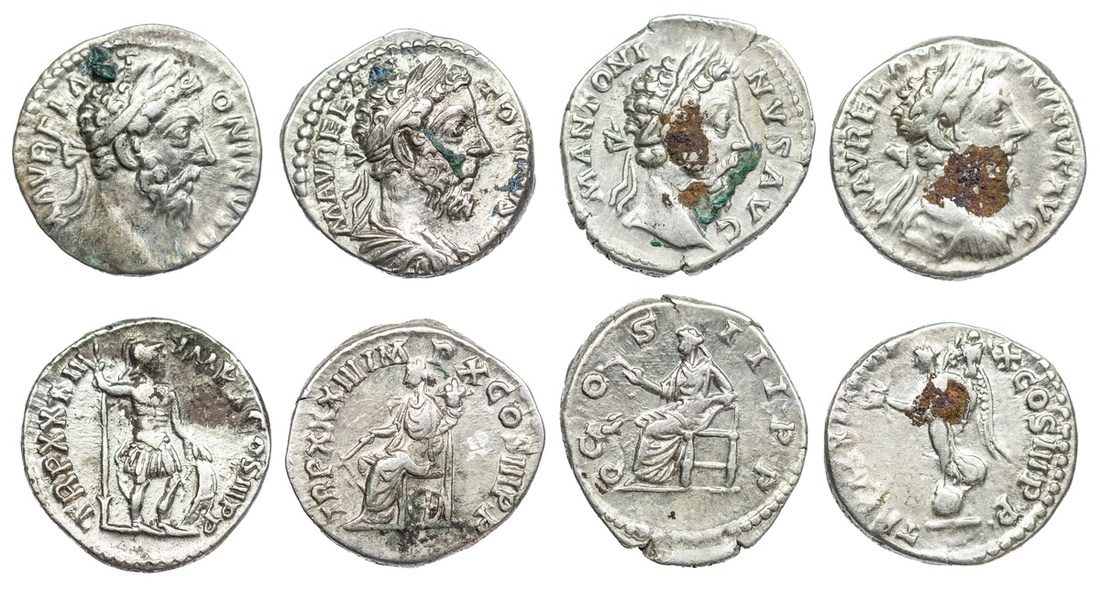 Roman Empire, Marcus Aurelius (AD 161-180), AR Denarii (4): i) Rome, struck 179, M AVREL ANTONINVS AVG, laureate and draped bust right, rev. TR P XXXIII IMP X COS III, Fortuna seated left, holding cornucopiae and rudder, 3.22g (RIC 402 var.; BMC 788 var.; Lliria Hoard: 39156: https://www.mupreva.org/nomisma/id/es/39156)), verdigris to portrait, but otherwise good fine to very fine, lustrous and with an unusual bust variety; ii) another, as before, struck 179, laureate head right, rev. TR P XXXIII IMP X COS III, Mars standing right with spear and shield, 2.22g (RIC 406; BMC 786), slight wear to surfaces, fine; iii) another, as before, struck 179, laureate, draped and cuirassed bust right, rev. TR P XXXIII IMP X COS III, Victory standing left on globe, holding trophy and wreath, 3.12g (RIC 404 var. (draped and cuirassed, plain drapery); BMC 791 var. (same)), spots of corrosion, about fine; iv) another, as before, M ANTONINVS AVG, laurel head right, rev. COS III P P, Salus seated left, holding branch, snake rising from ground to left, 2.94g (RIC 425 var.; BMC 696 var. (obverse legend as BMC 691)), near very fine, deposits and verdigris to portrait; (4).