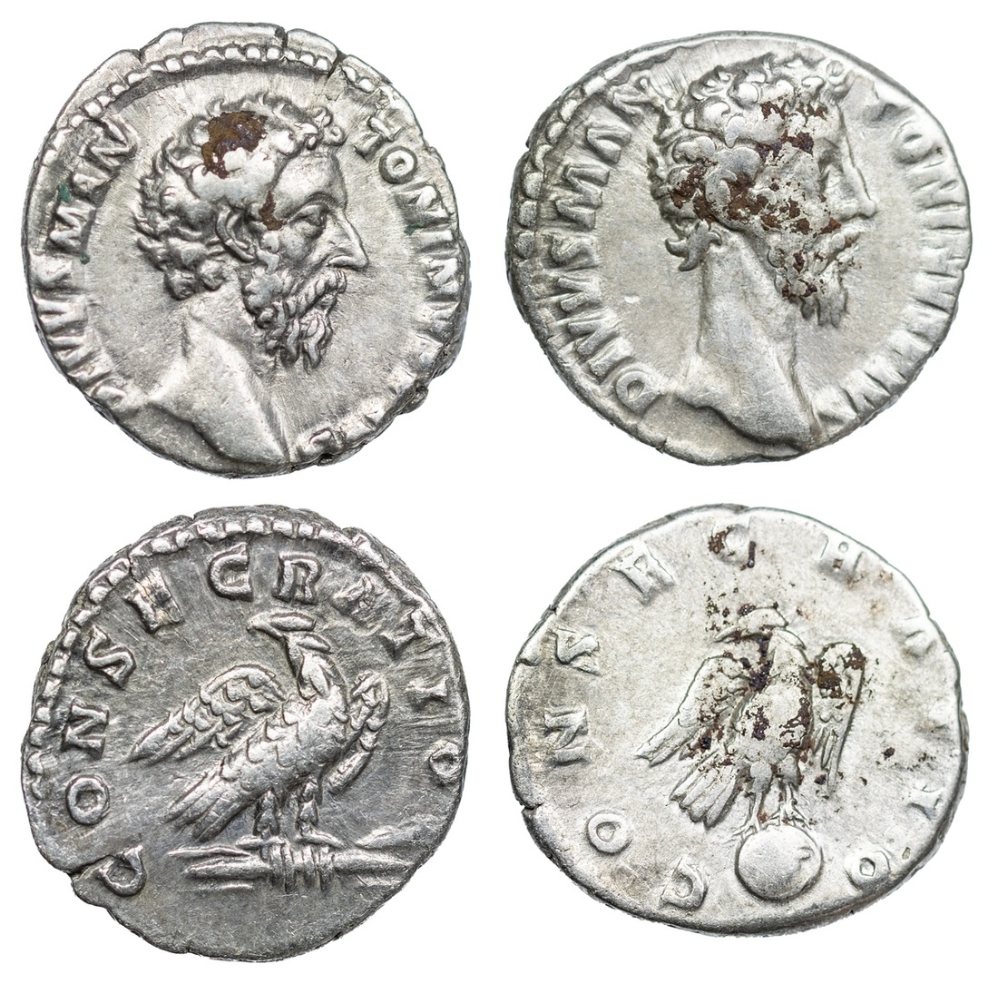 Roman Empire, Divus Marcus Aurelius, struck under Commodus (AD 180-192), AR Denarii (2): i) Rome, DIVVS M ANTONINVS PIVS, bare head right, rev. CONSECRATIO, eagle standing right on globe, head left, 3.11g (RIC 273; BMC 20), lustrous, some deposits, fine; ii) another, as before, rev. CONSECRATIO, eagle standing right on thunderbolt, head left, 2.47g (RIC 269; BMC 22), very fine or better; (2).