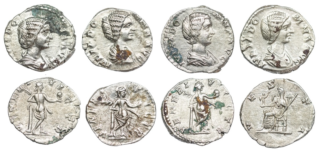 Roman Empire, Julia Domna, struck under Septimius Severus (AD 193-211), Civil War Issues, AR Denarii (4): i) Rome, IVLIA DOMNA AVG, draped bust right, rev. VENERI VICTR, Venus standing right, holding globe and leaning on column, 3.03g (RIC 536; BMC 49), good fine; ii) another, as before, 1.89g, fine; iii) another, Possible Contemporary Plated Forgery (per BM Report), as before, 1.85g, good to fine; iv) another, as before, rev. VESTA, Vesta seated left, holding palladium and sceptre, 3.09g (RIC 538; BMC 56), lustrous, near very fine; (4).