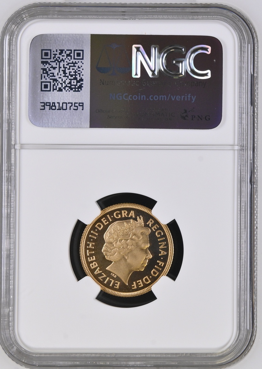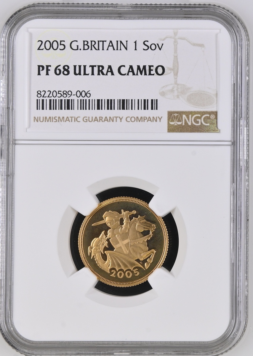 (g) NGC PF68 ULTRA CAMEO | Elizabeth II (1952-2022), Proof Sovereign, 2005, St George and the Dragon, by Ian Rank-Broadley and Timothy Noad, edge milled, 7.98g*, 12h (Marsh 322A; S.SC6), brilliant uncirculated, only 12,500 struck, in NGC holder, graded PF68 ULTRA CAMEO (Cert. #8220589-006)