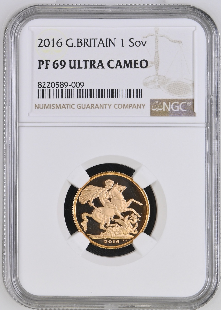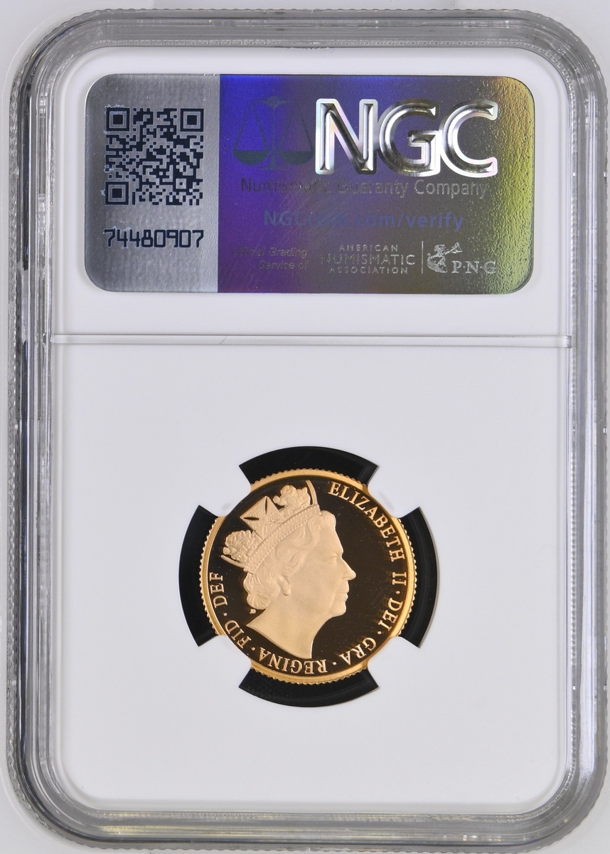 (g) NGC PF69 ULTRA CAMEO | Elizabeth II (1952-2022), Proof Sovereign, 2016, Sixth Celebratory Portrait for Her Majesty's 90th Birthday, by James Butler and Benedetto Pistrucci, edge milled, 7.98g*, 12h (Marsh 346A; S.SC10), brilliant uncirculated, only 9,661 issued, in NGC holder, graded PF69 ULTRA CAMEO (Cert. #8220589-009)