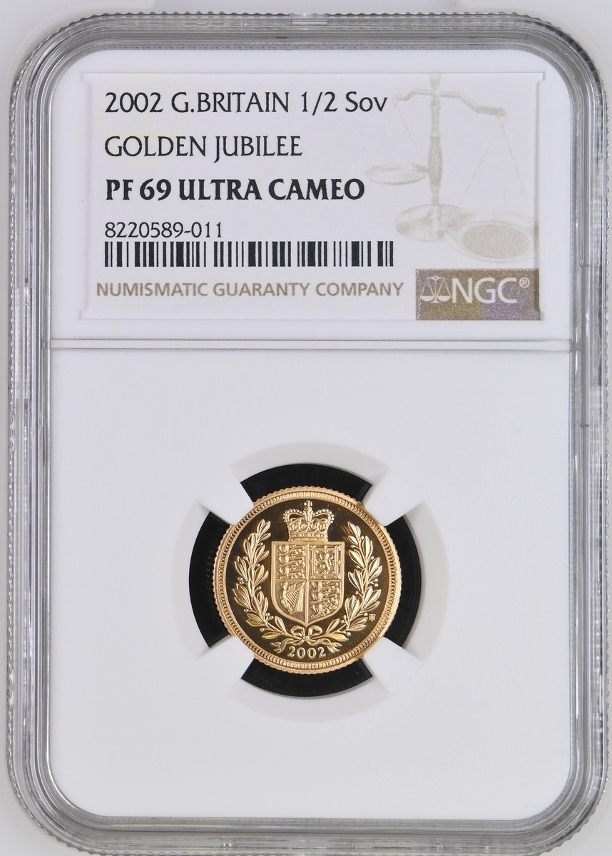 (g) NGC PF69 ULTRA CAMEO | Elizabeth II (1952-2022), Proof Half-Sovereign, 2002, Golden Jubilee of Her Majesty's Reign, by Ian Rank-Broadley and Timothy Noad, edge milled, 3.99g*, 12h (Marsh 547A; S.SB5), brilliant uncirculated, only 12,500 struck, in NGC holder, graded PF69 ULTRA CAMEO (Cert. #8220589-011)