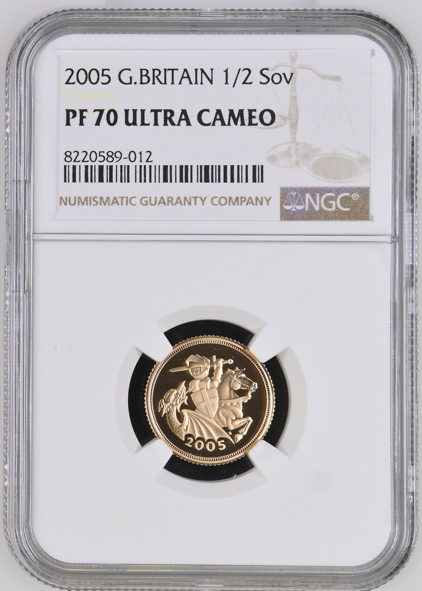 (g) NGC PF70 UCAM | Elizabeth II (1952-2022), Gold Proof Half-Sovereign, 2005, St George and the Dragon, by Ian Rank-Broadley and Timothy Noad, edge milled, 3.99g*, 12h (Marsh 551; S.SB6), brilliant uncirculated, only 12,500 struck, in NGC holder, graded PF70 ULTRA CAMEO (Cert. #8220589-12)