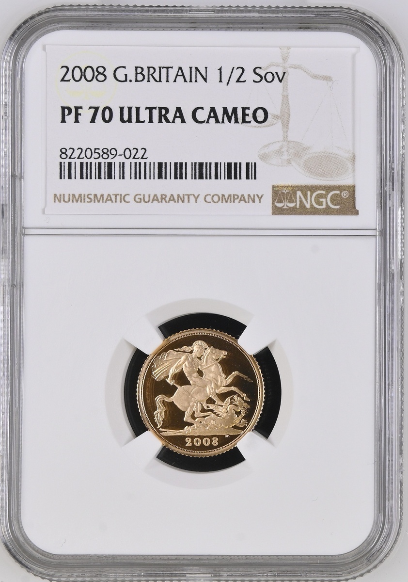 (g) NGC PF70 ULTRA CAMEO | Elizabeth II (1952-2022), Proof Half-Sovereign, 2008, crowned bust right, by Ian Rank-Broadley, rev. St George and Dragon, edge milled, 12h (S.SB4), brilliant as struck, in NGC holder, graded PF70 ULTRA CAMEO (Cert. #8220589-022)
