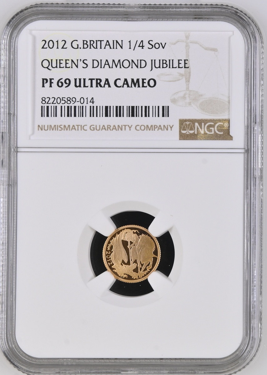 (g) NGC PF69 ULTRA CAMEO | Elizabeth II (1952-2022), Proof Quarter-Sovereign, 2012, Diamond Jubilee of Her Majesty's Reign, by Ian Rank-Broadley and Paul Day, edge milled, 1.49g*, 12h (S.SA2), brilliant uncirculated, only 4,900 released, in NGC holder, graded PF69 ULTRA CAMEO (Cert. #8220589-014)