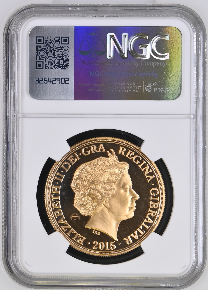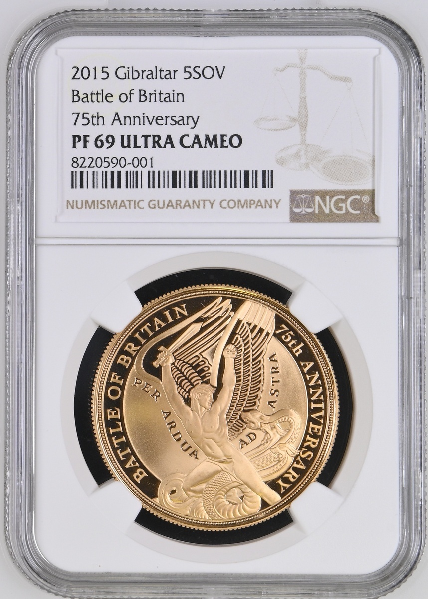 (g) NGC PF69 ULTRA CAMEO | Gibraltar, Elizabeth II (1952-2022), Proof Five-Pounds, 2015, Battle of Britain, 75th Anniversary, crowned bust right, by Ian Rank-Broadley, edge milled, 12h, brilliant as struck, in NGC holder, graded PF69 ULTRA CAMEO (Cert. #8220590-001)