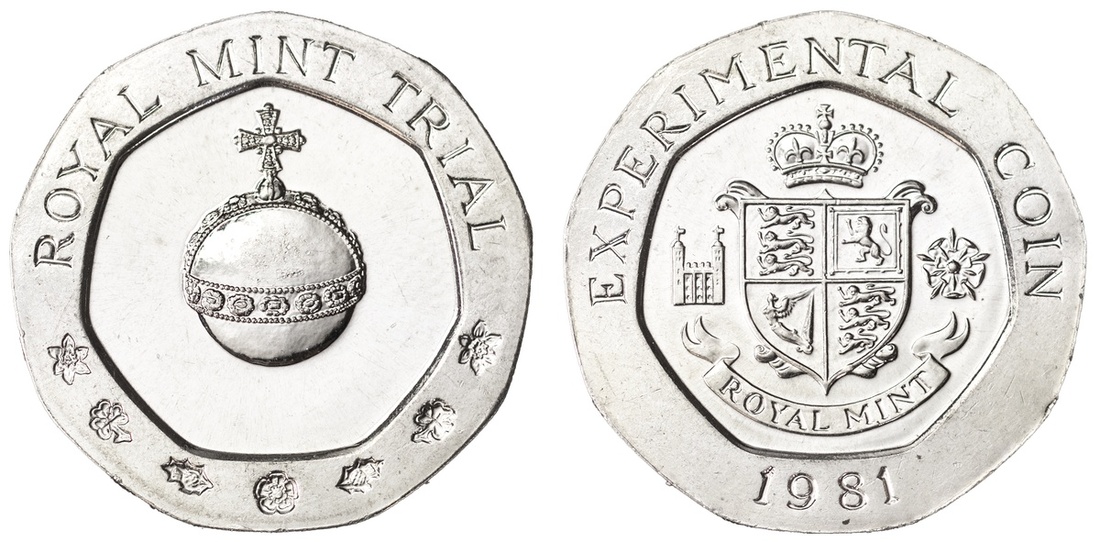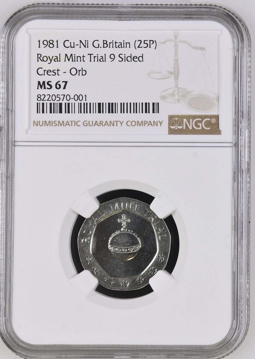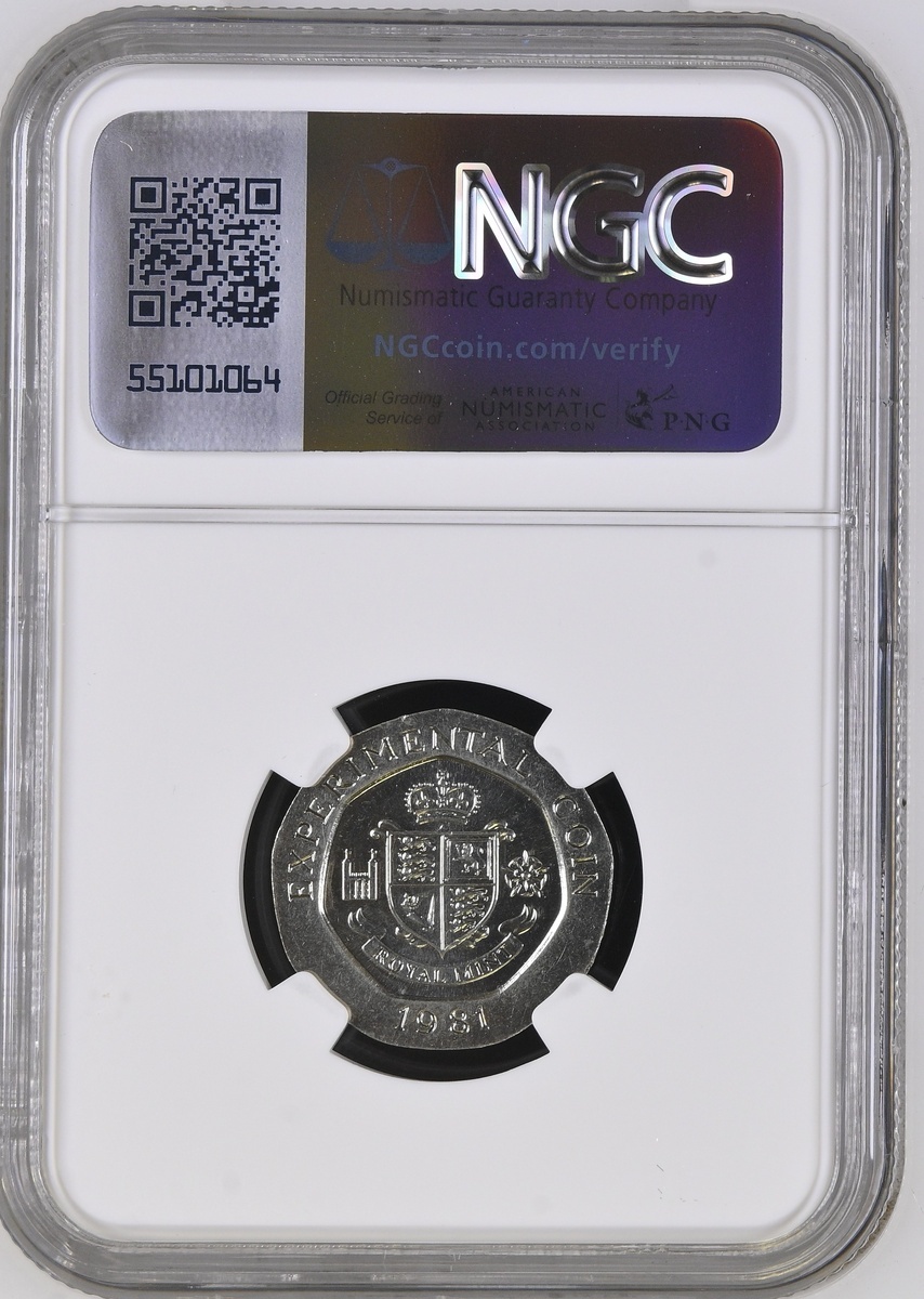 NGC MS67 | Euro Trials | Elizabeth II (1952-2022), Royal Mint Experimental Trial, Pattern for a 20-Cent, '1981', but struck c. 1994-1996, in nickel-silver, ROYAL MINT TRIAL, emblems of the United Kingdom below, sceptre within, rev. EXPERIMENTAL COIN 1981, crown and Royal shield, tower and rose flanking, ROYAL MINT in scroll beneath, edge plain, 5.62g, 12h, some minor friction marks, otherwise with a brilliance to the fields, much as struck, scarce, in NGC holder, graded MS67 (Cert. #8220570-001)
