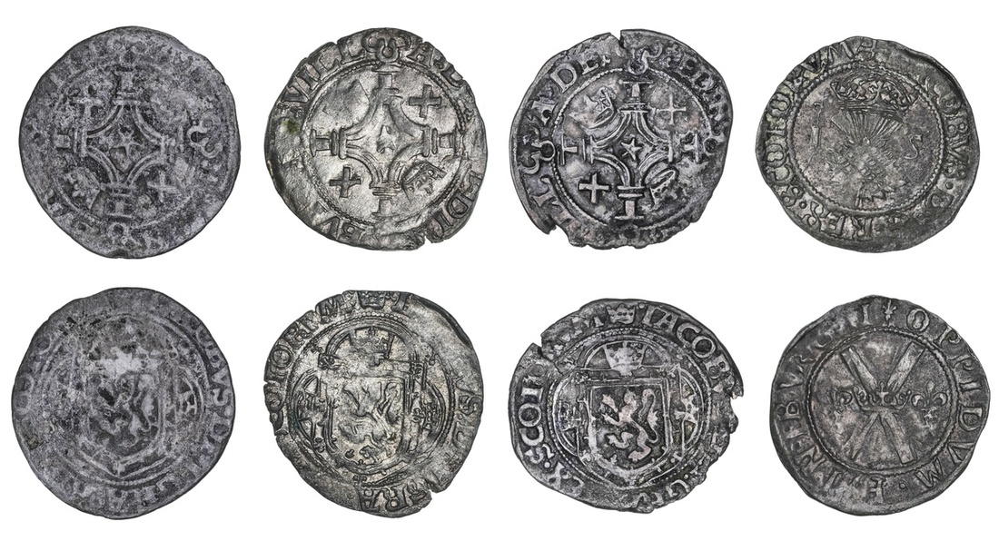 Scotland, James V (1513-1542), First Coinage, Billon Placks (3), crowns and saltires in alternate angles of cross, mullet in the centre, 1.83g; 1.75g; 1.97g (S.5281), each clipped, various shades of toning, all fair to fine; and Third Coinage, Bawbee, crowned thistle dividing I and 5, rev. crown on saltire cross, lis either side, 1.87g (S.5383), relatively round flan, details softened but otherwise very fine (4)