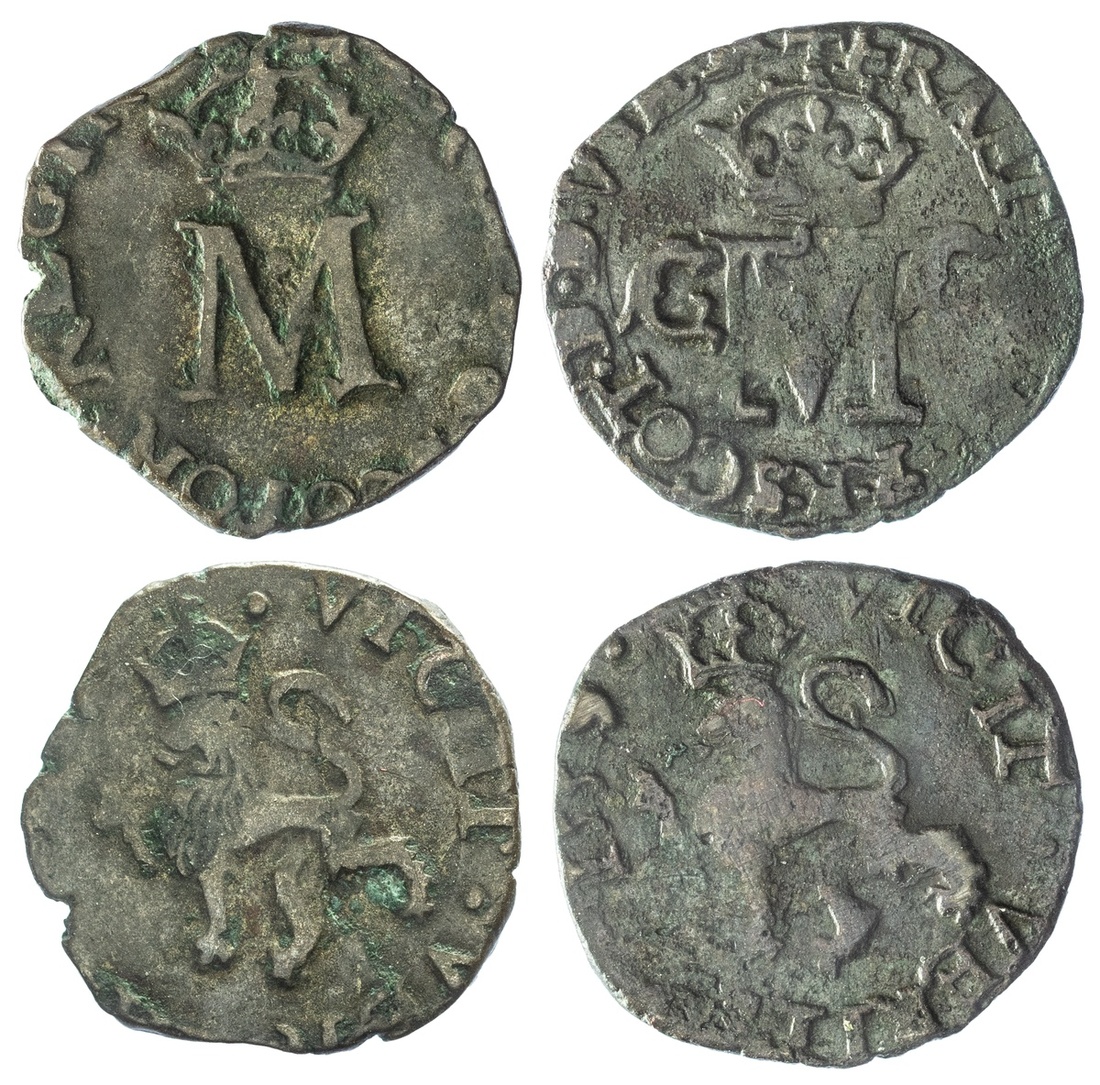 Scotland, Mary (1542-1567), First Period [Before Marriage] (1542-1558), Issue of 23/24 Alloy, Lion, 1558, crowned M monogram, rev. crowned rampant lion, 1.19g, 6h (S.5445), ragged to the edge and date not visible, otherwise pleasing to devices, about very fine; Mary and Francis, Second Period (1558-1560), Issue of 23/24 Alloy, Lion or Hardhead, 1559, crowned FM monogram, dolphin either side, rev. crowned rampant lion, 0.83g, 12h (S.5449), soft in parts, about very fine (2)
