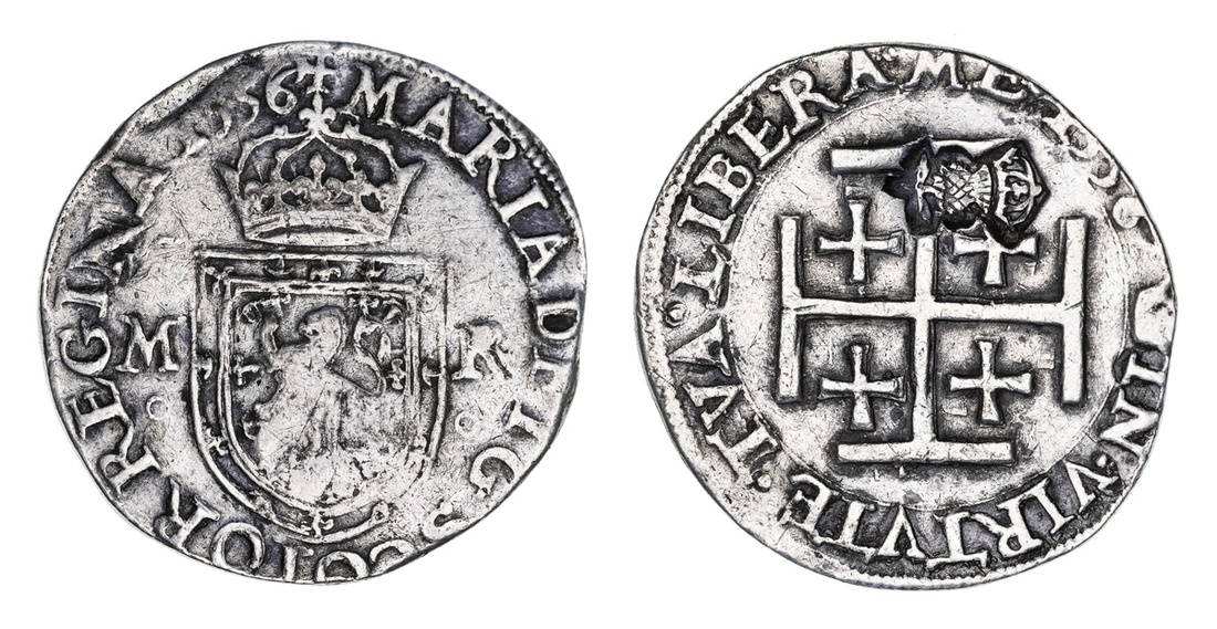 Scotland, James VI (1567-1625), Countermarked Testoon of Mary, during Revaluation of 1578, First Period, Type III, 1556, crowned thistle countermark in first quarter, 5.77g; 9h (S.5404), slightly clipped, but a bold striking with clear countermark on the reverse, nicely toned, very rare, very fine