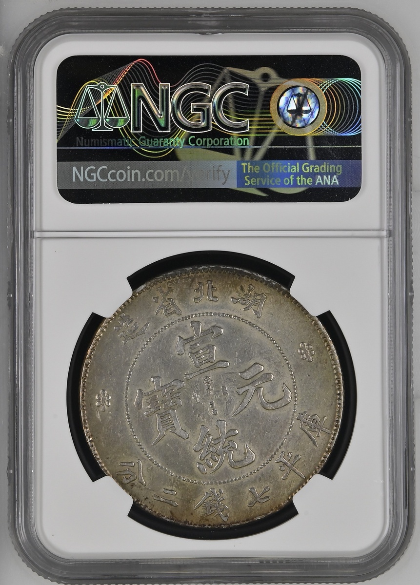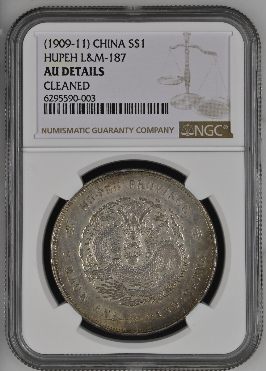 NGC AU | China, Hu-Peh Province (1909-1911), Dollar of 7 Mace and 6 Candareens, undated, Hsüan-t'ung Yüan-pao, rev. flying Imperial dragon facing, milled edge, 11h (L&M 187; Y 260), wiped and with hairline die flaws to the reverse legend, some ghosting to obverse centre, very fine, in NGC holder, graded AU DETAILS ~ Cleaned (Cert. #6295590-003)