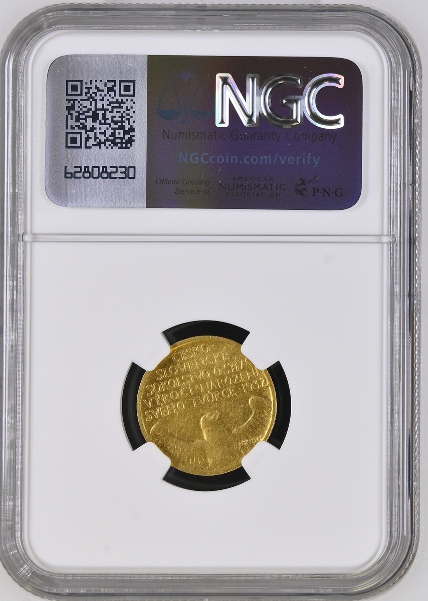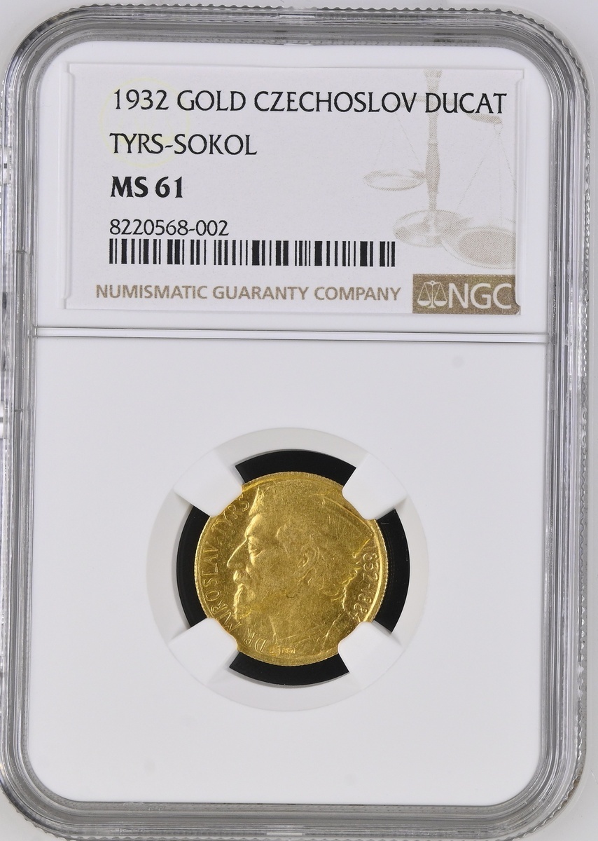 (g) NGC MS61 | Czechoslovakia, First Republic (1918-1938), 1 Dukát, 1932, Birth Centenary of Dr Miroslav Tyrš (Sokol Founder), DR · MIROSLAV · TYRŠ, bust left, rev. CESKO- SLOVENSKÉ SOKOLSTVO O STÉM VÝROCÍ NAROZENí SVÉHO TVURCE · 1932, 3.49g, 11h (Cuhaj M12; Friedberg 11), one of 1,742 minted, rare, a few contact marks and small edge bruises but otherwise near uncirculated, in NGC holder, graded MS61 (Cert. #8220568-002)