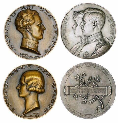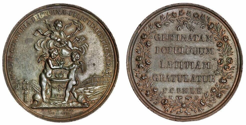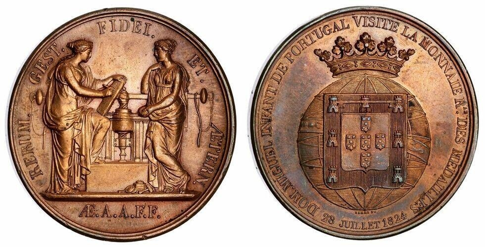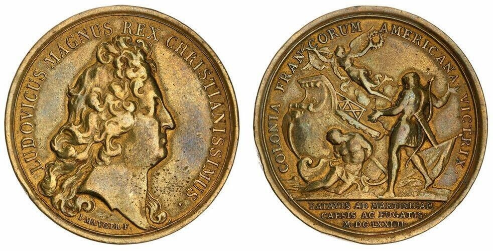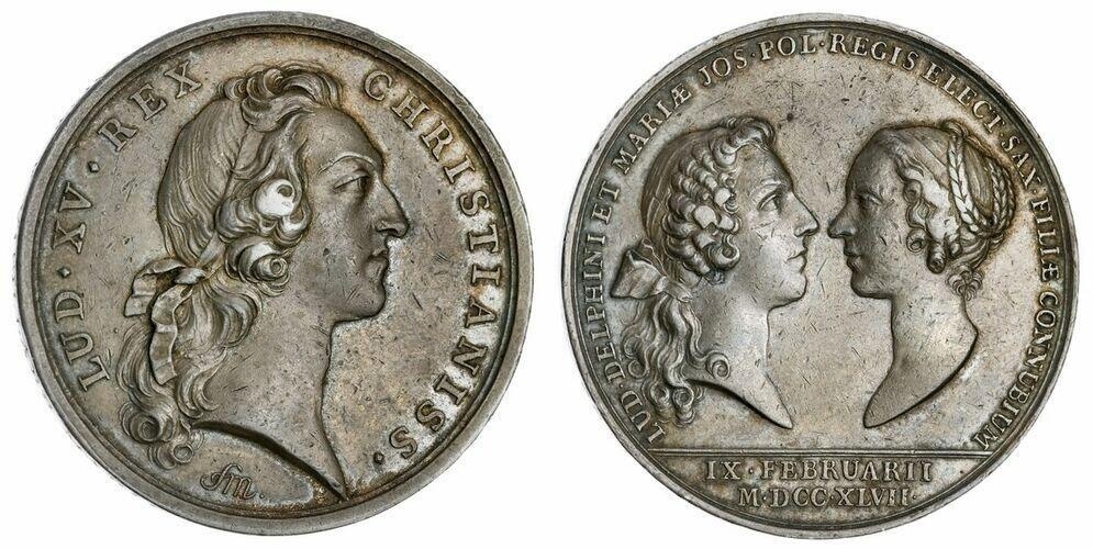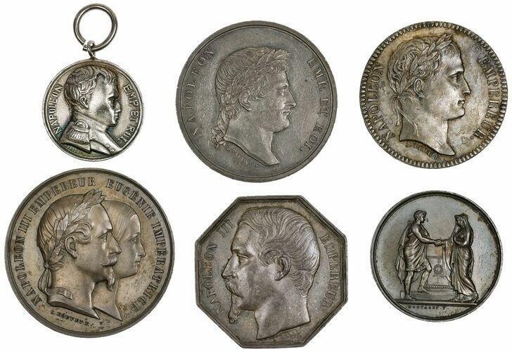 (x) World Coins and Medals (20) | France, Defeat of the Dutch at Martinique, Modern Yellow Bronze Restrike of Medal, 1674, by I. Mauger, LUDOVICUS MAGNUS REX CHRISTIANISSIMUS ., bust right, rev. COLONIA FRANCORUM AMERICANA VICTRIX ., Dutch sailor in chains, ship wreck behind, Victory with trumpet flies triumphantly overhead, BATAVIS AD MARTINICAM CAESIS AC FUGATIS . M.DC.LCCIIII. in exergue in three lines, 40mm, 35.98g (Divo 139; van Loon, III, 148), 'BRONZE' on edge, lightly contact marked and previously cleaned, some staining to the edge at 12 o'clock, very fine; France, Marriage of the Dauphin to Marie Therese of Spain, AR Medal, 1747, by F. Marteau, LUD · XV · REX CHRISTIANISS ·, bust right, rev. LUD · DELPHINI ET MARIAE JOS · POL · REGIS ELECT · SAX · FILLAE CONNUBIUM, busts vis-à-vis, IX · FEBRUARII M · DCC · XLVII · in exergue in two lines, 41mm, 31.93g, lightly bagmarked yet with some toning to dark surfaces, bolder very fine; France, Napoleon and the Empress [Marie-Louise of Austria?], AR Medal, c. 1810, by Montagny, Napoleon and Empress in classical dress before altar, rev. AB monogram within floral wreath, MCM below, 28mm, 10.88g, with a handsome lustre and tone, extremely fine; Notaries of Rouen, AR Medal, 1811, by Jaley, NAPOLEON EMP. ET ROI., laureate bust right, rev. LEX EST QUODCUMQUE NOTAMUS, female figure seated at desk dressed in classical attire, NOTAIRES DE L'ARR.T DE ROUEN. SEINE INF.RE MDCCCXI in exergue in three lines, 35mm, 18.52g (Bramsen 1142), heavily hairlined, otherwise toned; Surrender of Napoleon, AR Medal, 1815, by Brenet, NAPOLEON EMP. ET ROI., uniformed bust right, rev. ships at sea, MDCCCXV in legend, 22mm, 6.64g, cleaned, about very fine, mounted for suspension; Death of Napoleon, AR Medal, by Andrieu, c.1821, NAPOLEON EMPEREUR., laureate bust right, rev. 69 | NE A AJACCIO 1769. | EMPEREUR 1804. | SACRE 1804. | ROI D'ITALIE 1805. | MORT | A. S