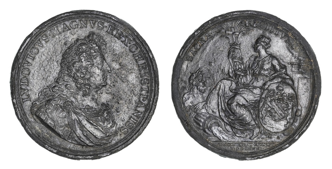 (x) France, Annexation of City of Strasbourg, AE Medal, 1681, by J. Roettiers/Molart, LVDOVICVS MAGNVS REX CHRISTIANISS, Louis XIV to the right, rev. SACRA RESTITVTA, Strasbourg seated on the left in front of the Rhine pouring out its urn, leaning against its shield, a cross in a bundle of palms decorated with lilies, 70mm, 98.99g (cf. Engel-Lehr 660), copy of very rare silver striking, roughness to the surfaces, deep patina, fine