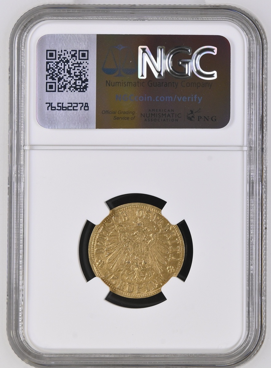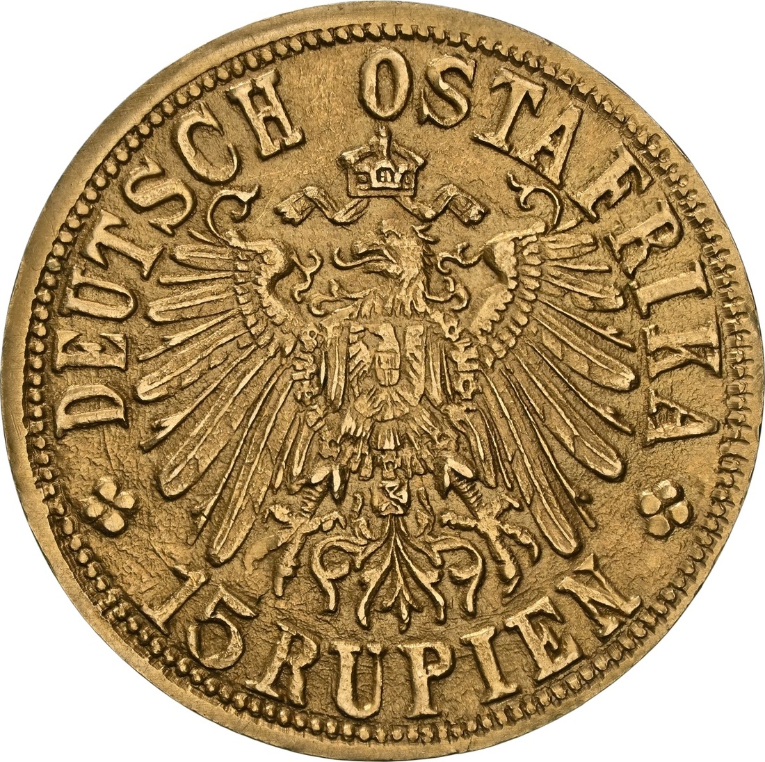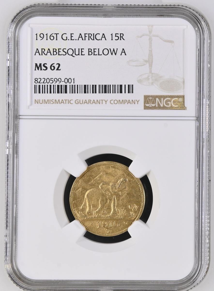 (g) NGC MS62 | German East Africa, Wilhelm II (1888-1918), Gold 15-Rupien, 1916 T, Tabora, DEUTSCH OSTAFRIKA * 15 RUPIEN * crowned Imperial eagle over value, rev. roaring Elephant facing right with raised trunk in front of the Kilamanjaro, •1916 • T, edge plain, 7.15g, 12h (Fb. 2; AKS 627; KM 16.1), , in NGC holder, graded MS62 (Cert. #8220599-001)