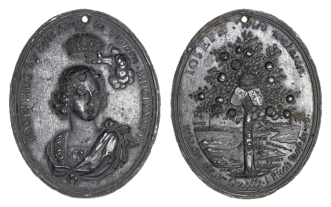 (x) Coronation of Hungarian King in Pressburg, Tin Medal, c.1687, by unknown, IOSEPHUS der erste König in Ungarn MDCLXXXVII ., armored bust facing, crowned by hand of God emerging from the clouds, rev. IOSEPH wird wachsen / wie an einer Quelle 1 Buch in Mose in 49 ., Pomegranate tree with coat of arms of Habsburg and Hungary; trunk inscribed IOSEPH., 76mm, 108.58g (cf. Horsky 2384), pierced, tin cast of silver medal, worn and slightly blundered to higher points, but otherwise fine