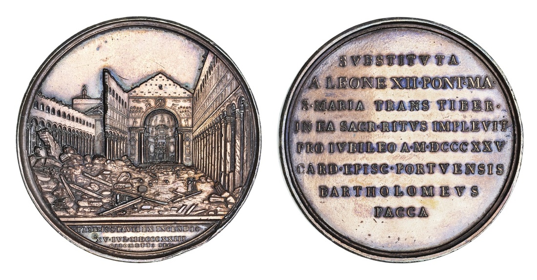 Italy, Jubilee of 1825 and Destruction of the Basilica of St Paul Outside the Walls, AE Medal, 19th Century, by Giuseppe Girometti, the Basilica in ruis, BASILIC S PAVLI EX INCENDIO XV IVL MDCCCXXIII, rev. SVBSTITVTA A LEONE XII PONT MA S MARIA TRANS TIBER IN EA SACR RITVS IMPLEVIT PRO IVBILEO A M DCCCXXV CARD EPISC PORTVENSIS BARTHOLOMEVS PACCA, in eight lines, 64.51g, 51mm (Mazio 632; Patrignani 46), previously cleaned and with some deposits to the fields, otherwise with red surfaces, about extremely fine