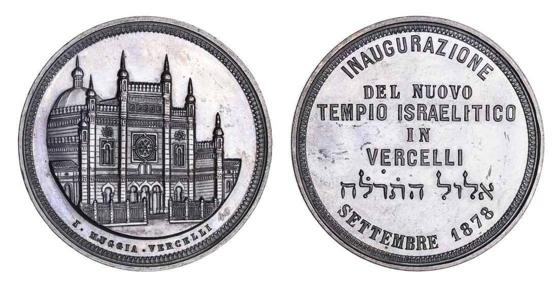 Italy, Inauguration of New Synagogue in Vercelli, AE Medal, 1878, by I. Muggia, view of synagogue, rev. inscription in seven lines, edge plain, 47mm, 39.75g, number '40' graffitied to obverse and with some minor surface marking, otherwise with a pleasing flashy lustre, extremely fine, scarce