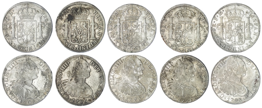 Mexico, Charles IV (1788-1808), 8-Reales, 1791 FM, Mexico City, laureate, draped and cuirassed bust right, rev. crowned shield within pillars, security edge, 26.96g, 12h (KM 109), soft in parts and some deposits to the edges, otherwise with a pleasing flashy lustre, very fine; another, 1792 FM, Mexico City, as before, security edge, 26.72g, 12h (KM 109), scratched to the edge, some minor metal stressing and hairlines, otherwise with a pleasing flashy lustre, bolder very fine; another, 1793 FM, Mexico City, as before, security edge, 26.83g, 12h (KM 109), area of light corrosion to reverse and minor contact marking, otherwise with a flashy lustre, good very fine; another, 1795 FM, Mexico City, as before, security edge, 26.74g, 12h (KM 109), lightly contact marked and dark toning to reverse, very fine; another, 1808 TH, Mexico City, as before, security edge, 26.81g, 12h, (KM 109), metal flaw to neck, irregular toning, otherwise with a pleasing flashy lustre, good very fine (5)