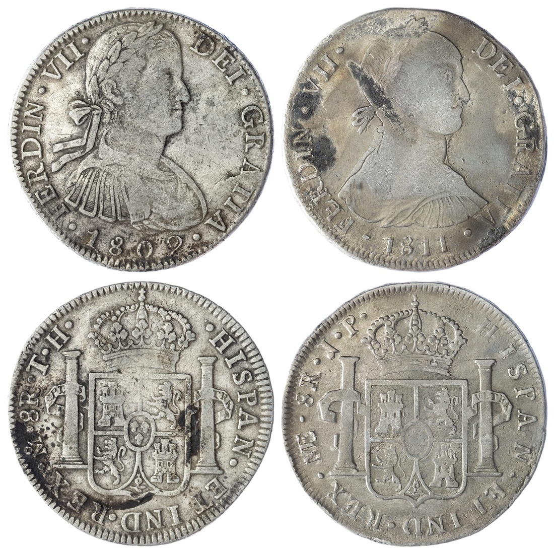 Mexico, Ferdinand VII (1808-1821), 8-Reales, 1809 TH, Mexico City, laureate, draped and cuirassed bust right, rev. crowned shield within pillars, security edge, 26.82g, 12h (KM 110), small metal flaw to A, dark deposits in parts, about very fine; Peru, Ferdinand VII (1808-1821), 8-Reales, 1811 JP, Lima, laureate, draped and cuirassed bust right, rev. crowned shield within pillars, security edge, 26.75g, 12h (KM 117.1), wiped and rubbed, irregular toning in parts, bold fine (2)