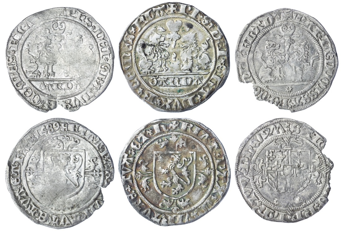 Netherlands, Flanders, Maria de Bourgogne (1477-1482), Double Briquet, 1477, Bruges, two seated lions facing, rev. shield over fleury cross, 2.81g, 1h (Bd.2274), heavily chipped to edge, otherwise about very fine; Duchy of Brabant, Philippe le Beau, (1482-1506), Revolt against Maximilian, Double Briquet, undated (c.1489), Ghent, two seated lions facing, GAnDA in exergue, rev. shield over fleury cross, 2.81g, 11h (Bd. 2282), softly struck in parts, otherwise richly cabinet toned, bolder fine, better in parts; another, Double Briquet, 1489, Ghent, as before, dated in legend, 2.62g, 3h (GH. 146a), chipped and mostly soft, yet with some lustre, bolder fine (3)