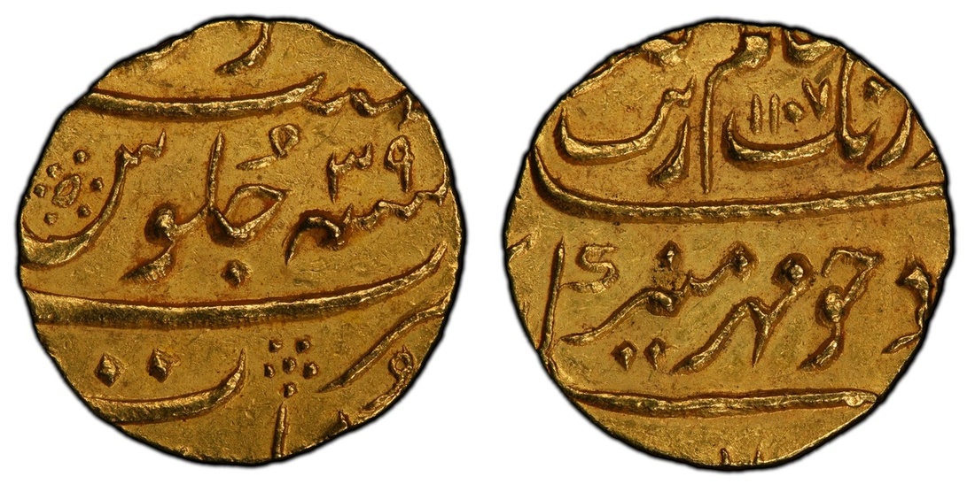 Mughal Empire, Aurangzeb (1658-1707), Mohur, AH1107/39 (1695), Surat, 11.07g (KM 315.45), shroff marked to the edge, otherwise a pleasing strike and date fully on flan, about extremely fine, in PCGS holder, graded AU DETAILS ~ Shroff marked (Cert. #39652985)