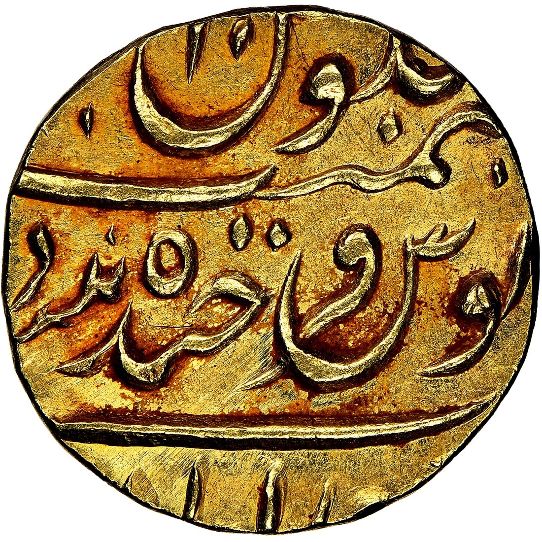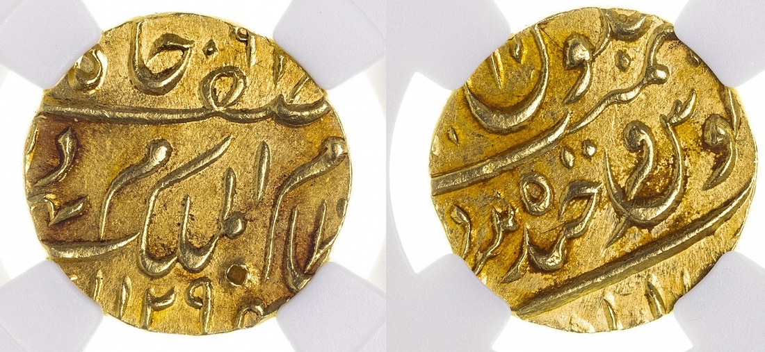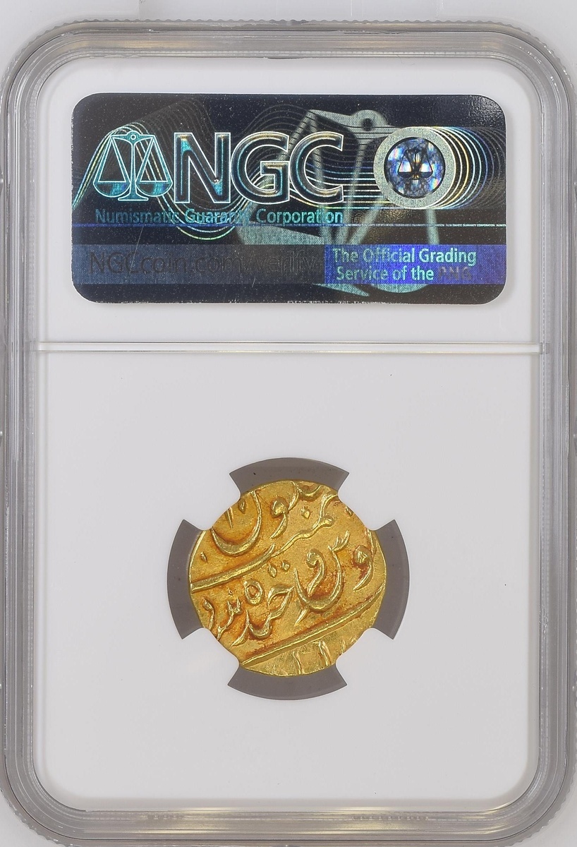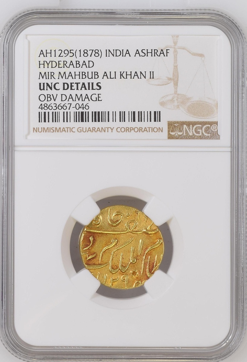(g) NGC UNC | Princely States, Hyderabad, Mir Mahbub Ali Khan II (1869-1911), gold Ashrafi, Farkhanda Bunyad Haidarabad, AH1294 or 5, year 10 (KM Y# 22), test punch to obverse, toned, good very fine, in NGC holder, graded UNC DETAILS ~ obv. damage (Cert. #4863667-046)