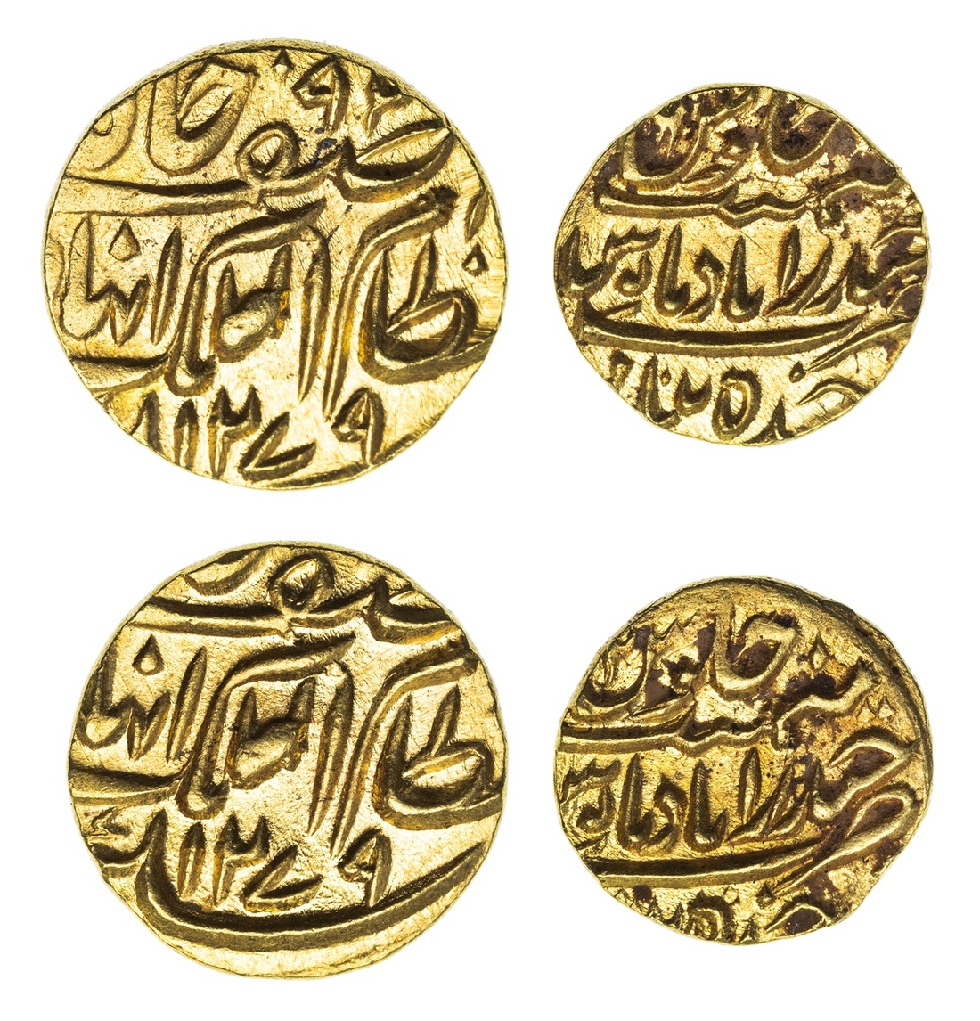 Princely States, Hyderabad, Afzal ad-Daula (1857-1869), gold Quarter-Mohur, 2.78g, Farkhanda Bunyad Haidarabad, AH1279, asaf jah nizam al-mulk with alif for Afzal before mulk (KM Y9), lustrous, uncirculated; another, gold Quarter-Mohur, 2.77g, Farkhanda Bunyad Haidarabad, AH1279, asaf jah nizam al-mulk with alif for Afzal before mulk (KM Y9), lustrous, uncirculated (2)