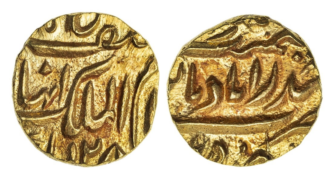 Princely States, Hyderabad, Afzal ad-Daula (1857-1869), gold Quarter-Mohur, 2.75g, Farkhanda Bunyad Haidarabad, AH128[?], asaf jah nizam al-mulk with alif for Afzal before mulk (KM Y9), struck from lightly rusted die, uncirculated