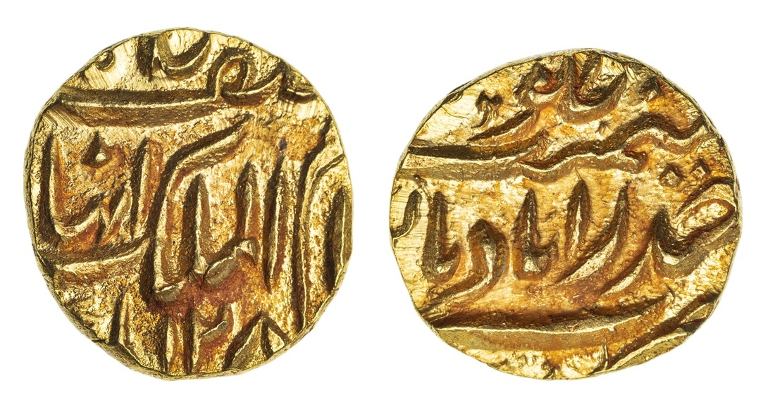 Princely States, Hyderabad, Afzal ad-Daula (1857-1869), gold Quarter-Mohur, 2.77g, Farkhanda Bunyad Haidarabad, AH128[?], asaf jah nizam al-mulk with alif for Afzal before mulk (KM Y9), struck from slightly rusted dies, uncirculated