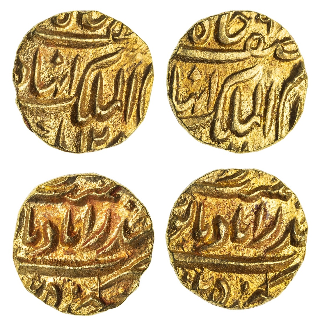 Princely States, Hyderabad, Afzal ad-Daula (1857-1869), gold Quarter-Mohur, 2.74g, Farkhanda Bunyad Haidarabad, AH128[?], asaf jah nizam al-mulk with alif for Afzal before mulk (KM Y9), struck from lightly rusted die, uncirculated; another, Princely States, Hyderabad, Afzal ad-Daula (1857-1869), gold Quarter-Mohur, 2.74g, Farkhanda Bunyad Haidarabad, AH128[?], asaf jah nizam al-mulk with alif for Afzal before mulk (KM Y9), extremely fine (2)