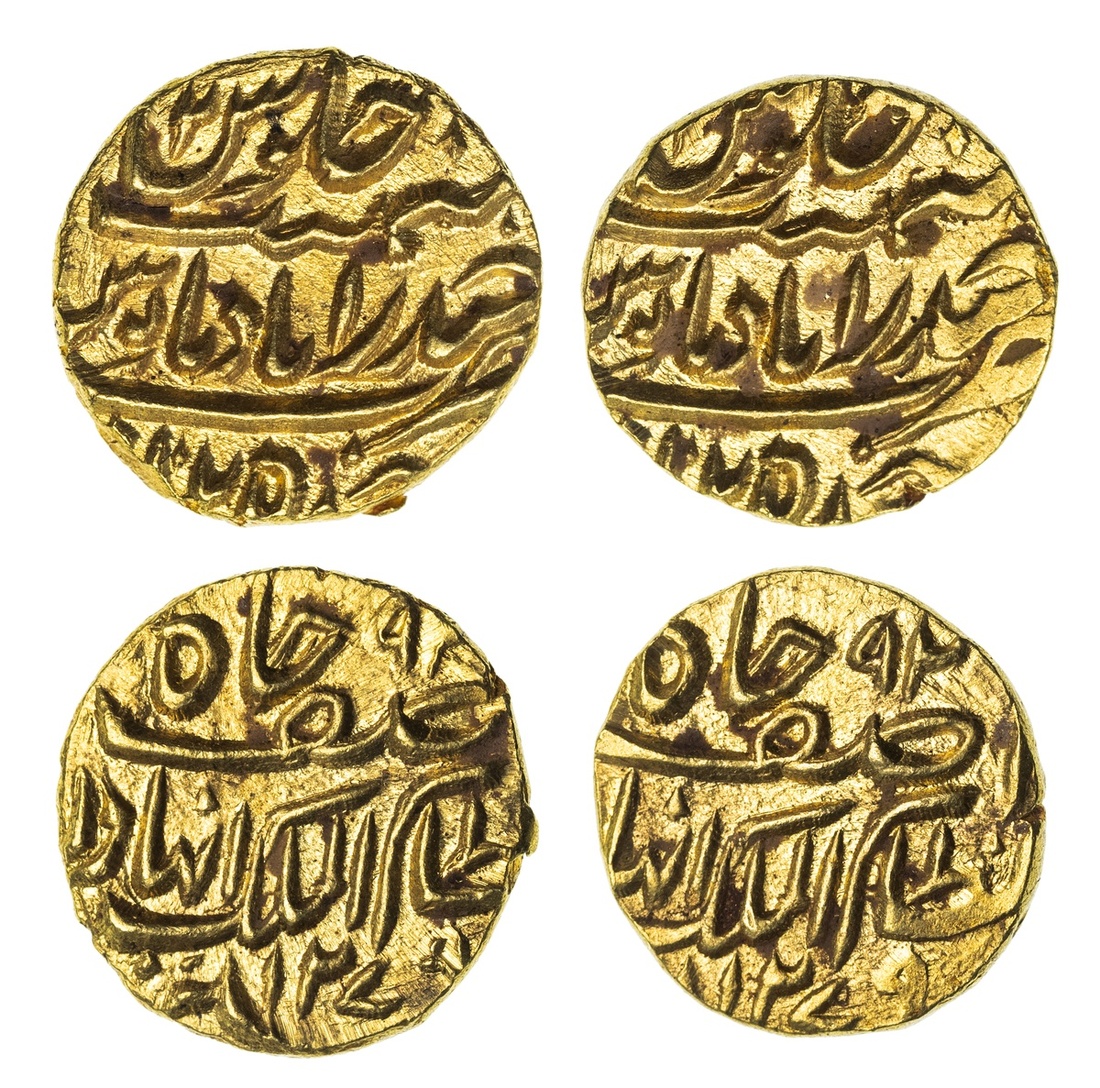 Princely States, Hyderabad, Afzal ad-Daula (1857-1869), gold Eighth-Mohur, 1.37g, Farkhanda Bunyad Haidarabad, AH1279 / 2 [6 retrograde?], asaf jah nizam al-mulk with alif for Afzal before mulk (KM Y8), pleasing lustre, uncirculated; another, gold Eighth-Mohur, 1.38g, Farkhanda Bunyad Haidarabad, AH1279 / 2 [6 retrograde?], asaf jah nizam al-mulk with alif for Afzal before mulk (KM Y8), pleasing lustre, uncirculated (2)