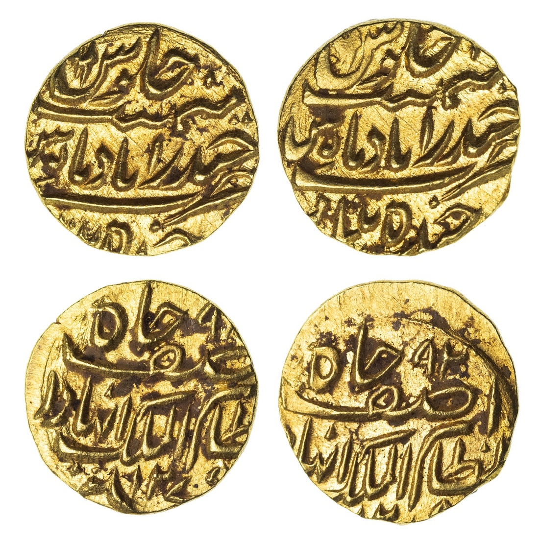 Princely States, Hyderabad, Afzal ad-Daula (1857-1869), gold Eighth-Mohur, 1.40g, Farkhanda Bunyad Haidarabad, AH1279 / 6, asaf jah nizam al-mulk with alif for Afzal before mulk (KM Y8), pleasing lustre, uncirculated; another, gold Eighth-Mohur, 1.39g, Farkhanda Bunyad Haidarabad, AH1279 / 2 [6 retrograde?], asaf jah nizam al-mulk with alif for Afzal before mulk (KM Y8), pleasing lustre, uncirculated (2)