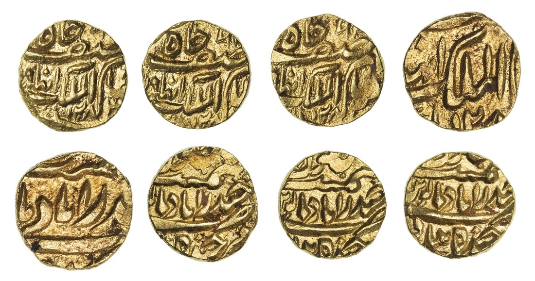 Princely States, Hyderabad, Afzal ad-Daula (1857-1869), gold Eighth-Mohur, 1.38g, Farkhanda Bunyad Haidarabad, AH128[2?/3?], asaf jah nizam al-mulk with alif for Afzal before mulk (KM Y8), extremely fine; another, gold Eighth-Mohur, 1.36g, Farkhanda Bunyad Haidarabad, AH1282, asaf jah nizam al-mulk with alif for Afzal before mulk (KM Y8), extremely fine; another, gold Eighth-Mohur, 1.38g, Farkhanda Bunyad Haidarabad, AH128[?], asaf jah nizam al-mulk with alif for Afzal before mulk (KM Y8), extremely fine; another, gold Eighth-Mohur, 1.38g, Farkhanda Bunyad Haidarabad, AH128?], asaf jah nizam al-mulk with alif for Afzal before mulk (KM Y8), extremely fine (4)