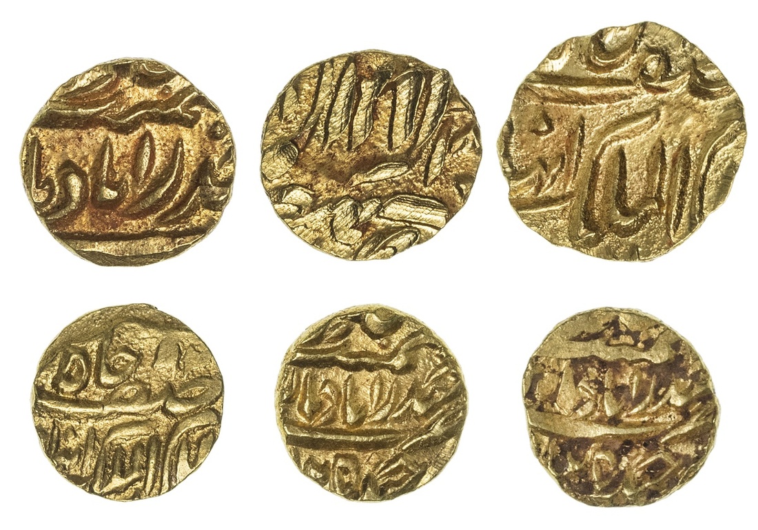 Princely States, Hyderabad, Afzal ad-Daula (1857-1869), gold Eighth-Mohur (5), 1.38g; 1.38g; 1.34g; 1.38g; 1.35g; 1.35g, Farkhanda Bunyad Haidarabad, date off flan, asaf jah nizam al-mulk with alif for Afzal before mulk (KM Y8), all extremely fine (5)