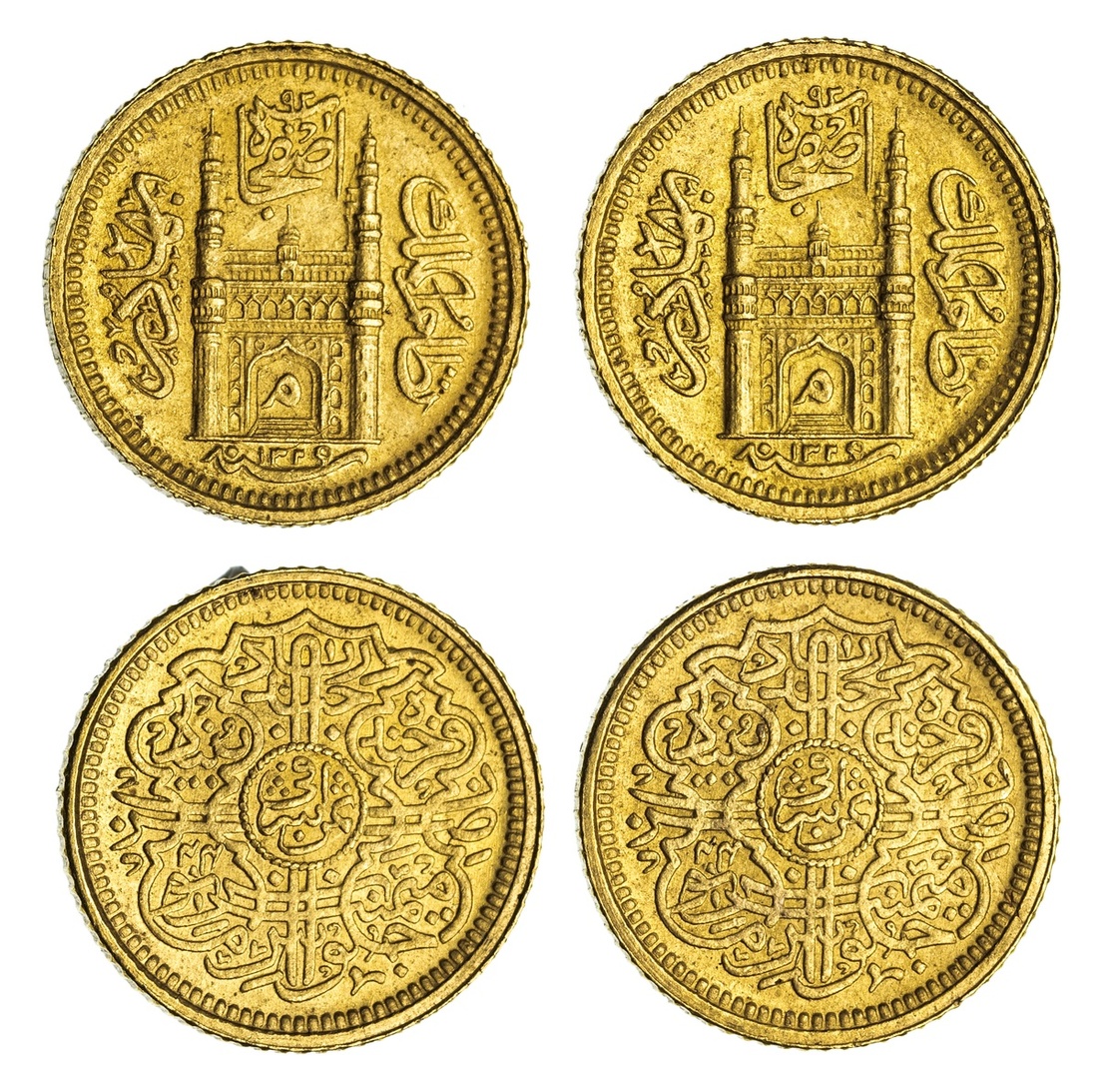 Princely States, Hyderabad, Mir Mahbub 'Ali Khan II (1869-1911), milled gold Eighth-Ashrafi, 1.39g, Haidarabad, AH1329 / 44, Char Minar with min within arch (KM Y# 41.2), lustrous, extremely fine; another, milled gold Eighth-Ashrafi, 1.39g, Haidarabad, AH1329 / 44, Char Minar with min within arch (KM Y# 41.2), lustrous, extremely fine (2)