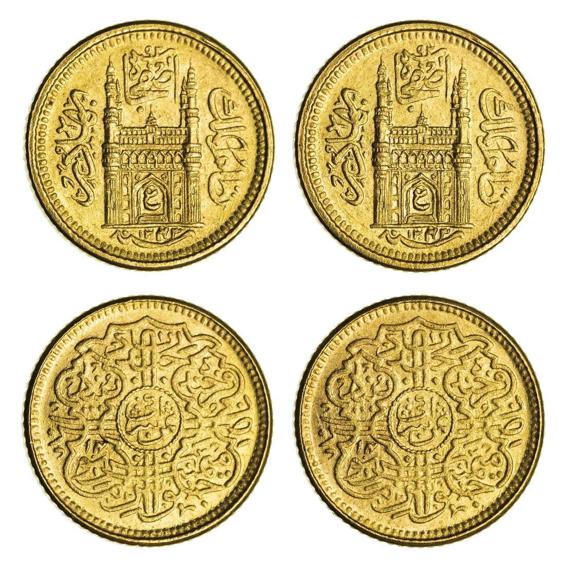 Princely States, Hyderabad, Mir Usman 'Ali Khan (1911-1948), milled gold Eighth-Ashrafi, 1.40g, Haidarabad, AH1343 / 14, Char Minar with ain within arch (KM Y54.2), uncirculated; another, Princely States, Hyderabad, Mir Usman 'Ali Khan (1911-1948), milled gold Eighth-Ashrafi, 1.36g, Haidarabad, AH1343 / 14, Char Minar with ain within arch (KM Y54.2), uncirculated (2)