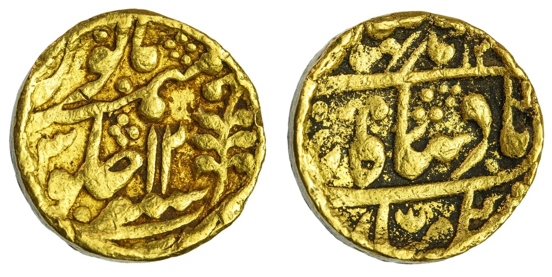 (g) Princely States, Jaipur, in the name of Bahadur Shah II (1837-1858), gold Mohur, 10.84g, Sawai Jaipur, ry 12 (KM 102), edge smoothed for jewellery mount and deposits to the fields, fine