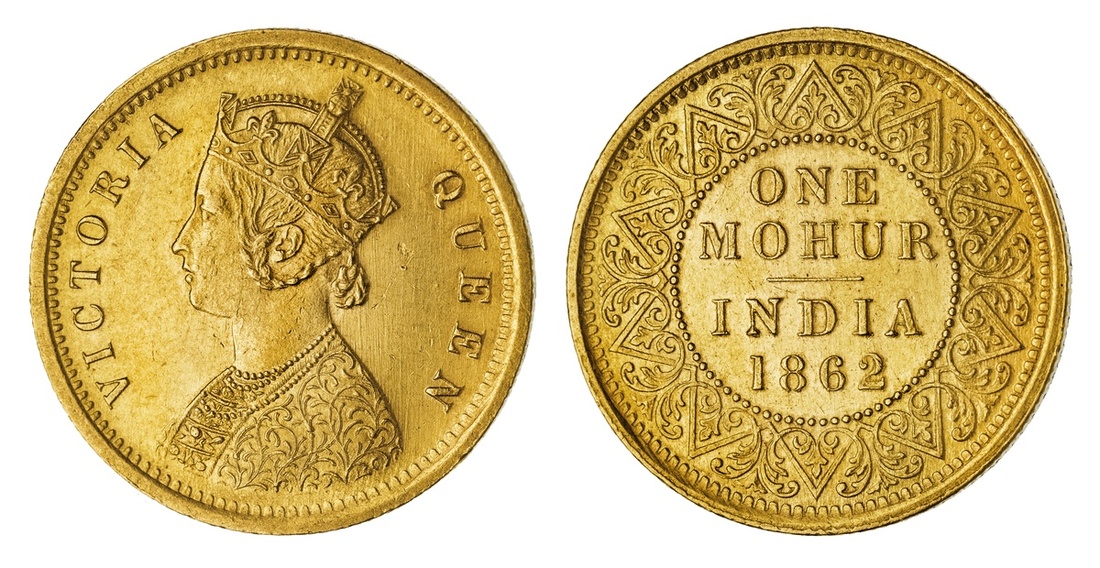 (g) British India, Victoria (1837-1901), Gold Mohur, 1862, Calcutta, crowned and draped bust left, two flowers to jabot, V on shoulder, rev. ONE MOHUR INDIA 1862 within decorative border, 12h, 11.66g, edge milled (Pr. 6; S&W 4.6; KM 480), light surface marking, nonetheless with a residual lustre, about extremely fine