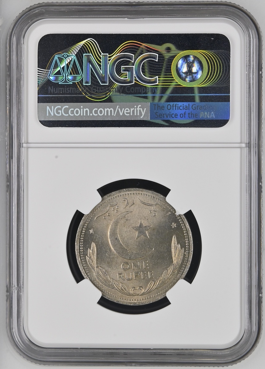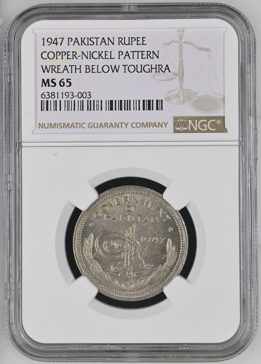 (x) NGC MS65 | Pakistan, Copper-Nickel Pattern Rupee, 1947, Type 3, toughra, date right, within wreath, surmounted by GOVERNMENT OF PAKISTAN, rev. crescent and star, ONE RUPEE below within wreath, milled edge, 12h (KM Pn3), with a pleasing light uniform tone to the surfaces, much as struck and extremely rare, an important early pattern scarcity within the coinage of Pakistan, in NGC holder graded MS65 (Cert. #6381193-003)