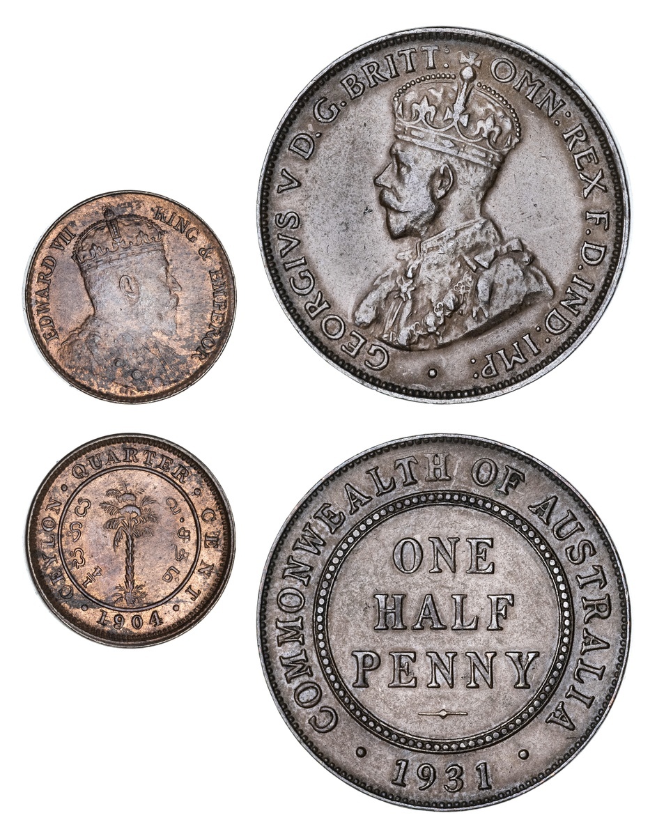 (x) British Commonwealth Copper (2) | including Sri Lanka (Ceylon), Edward VII (1901-1910), 1/4 Cent, 1904, 1.22g, 12h (KM 100; Pridmore 251), residual flashy lustre present, uncirculated; and Australia, George V (1910-1936), Halfpenny, 1931, Melbourne, 5.65g, 12h, no m.m. (KM 22; Schön 13), red brown tones, very fine (2)